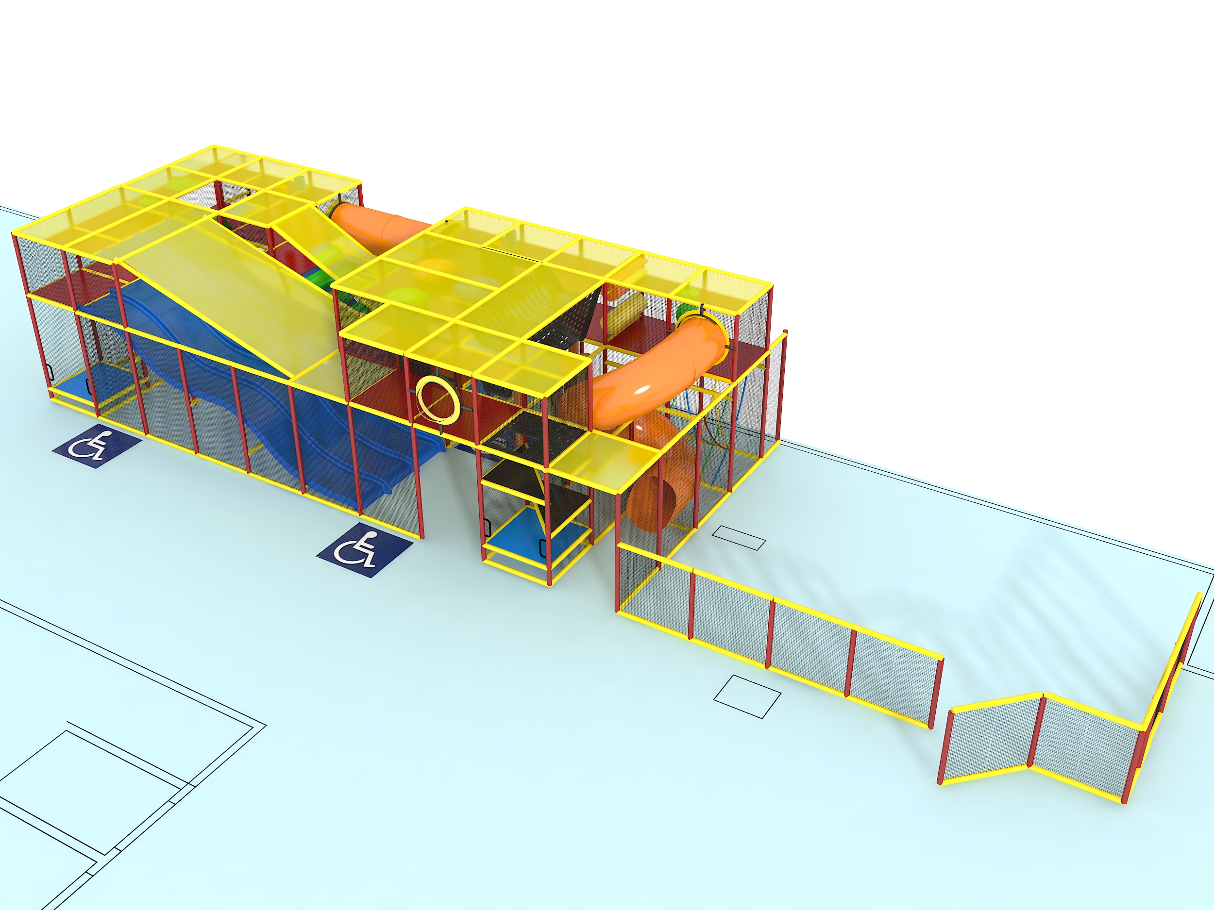 Indoor Playground GPS1240 is a custom indoor playsystem for children three to twelve years of age. The softplay unit measures 64 ft. wide by 11 ft. high and a length of 16 ft. The minimum room space required for this children’s play equipment is approximately 70 ft. room width with a 13 ft. ceiling and 22 ft. room length. Total area: 1024 sq ft. Medium Size Indoor Playground.