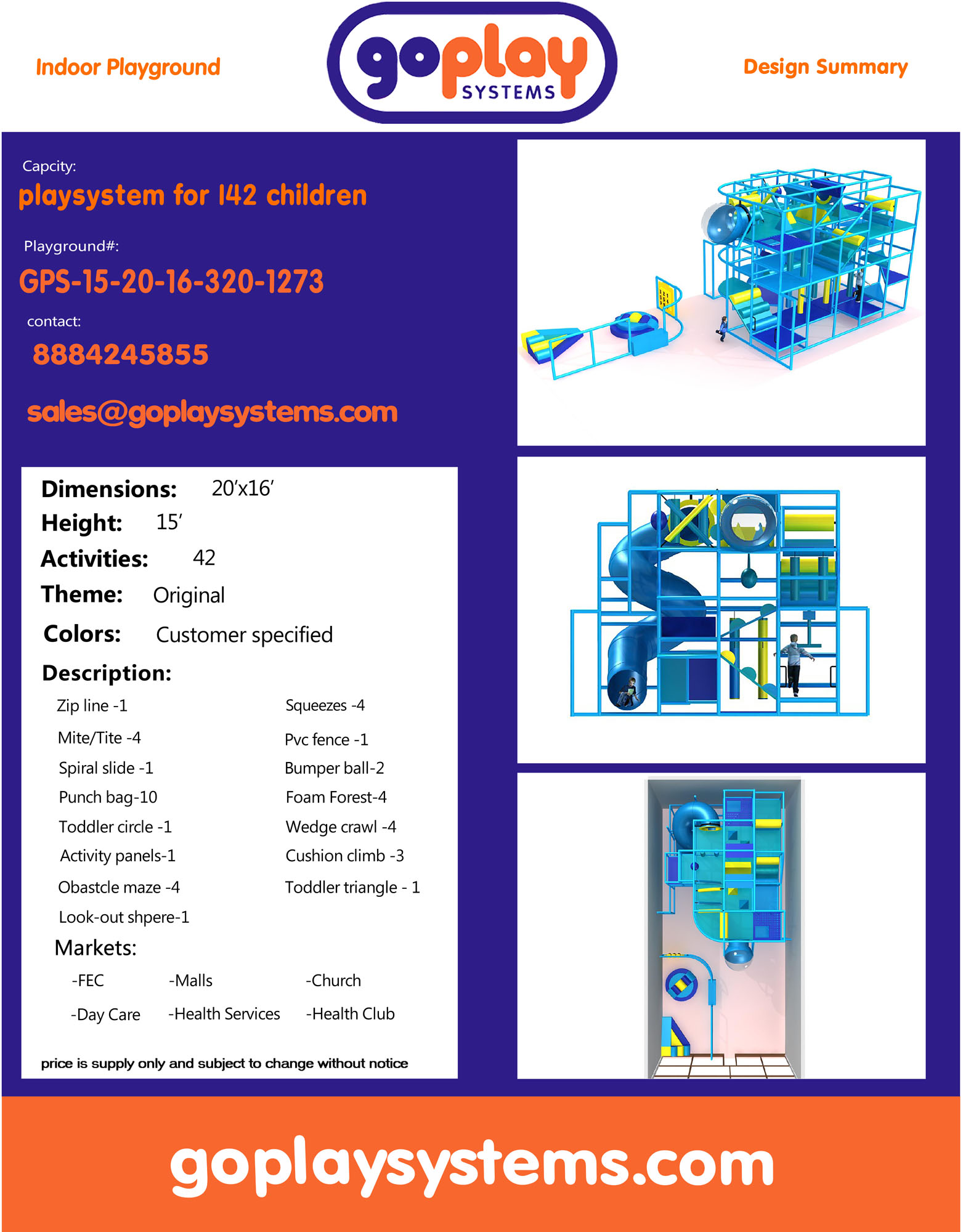 Indoor Playground GPS 1273 is a custom designed module soft play system for kids. The playground system measures 16ft. H x 15ft. W x 20ft. L.