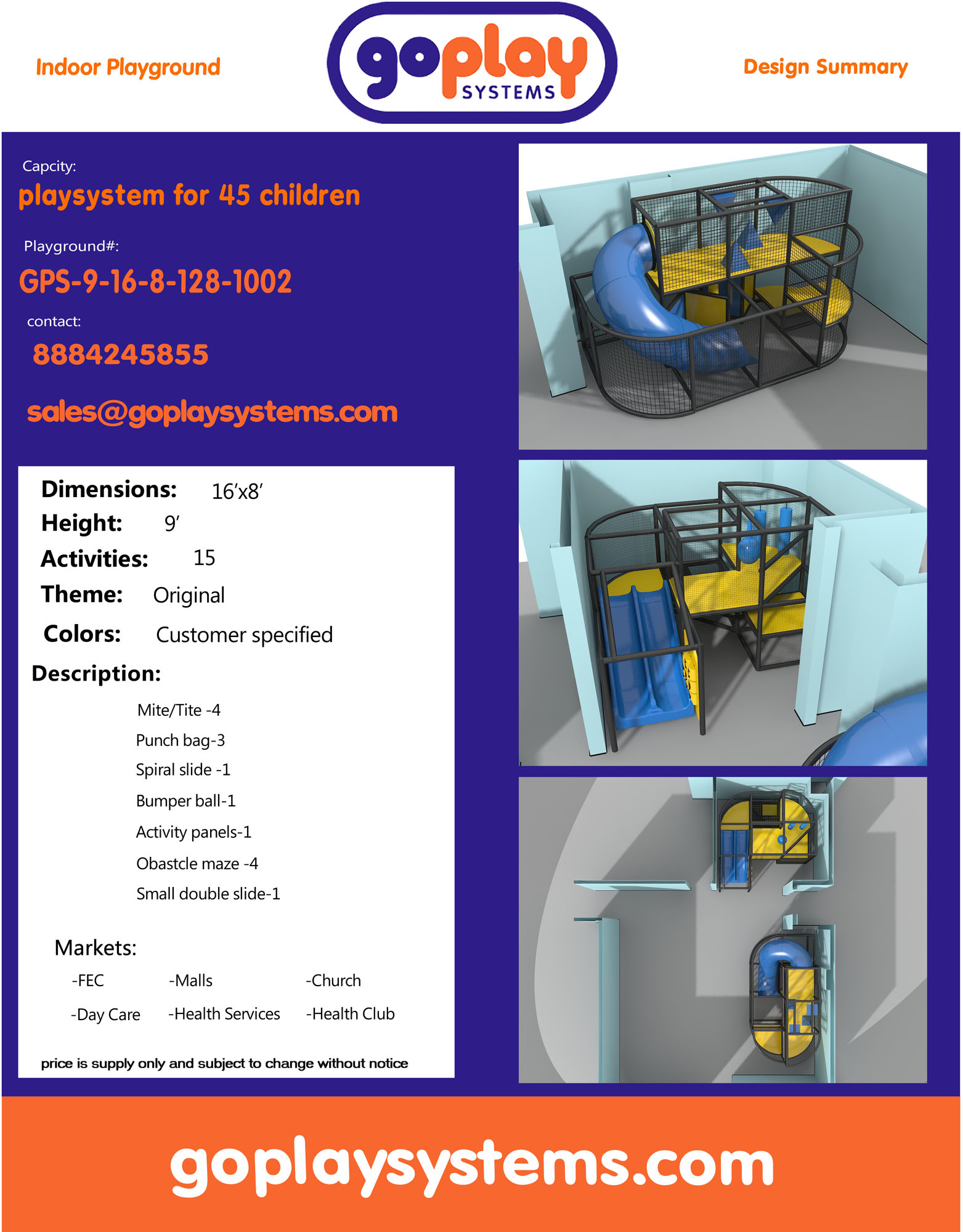 Indoor Playground GPS1002 is a custom designed module soft play system. The playground system measures 9 ft. H x 16 ft. W x 8 ft.