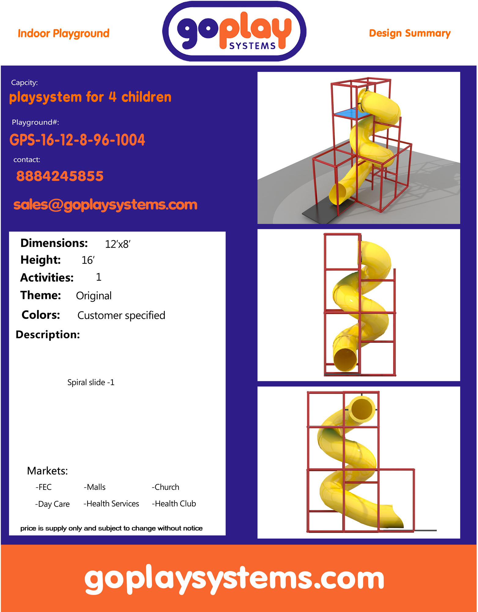 Availability: In-stock Brand: Go Play Systems SKU: gps-16-12-8-96-1004 Shipping: Free Shipping US to lower 48 states. Shipping Policy Return and Refund Policy *GoPlay sells worldwide. Prices may not include additional shipping and handling charges to your specific location. Contact us for current international shipping rates.