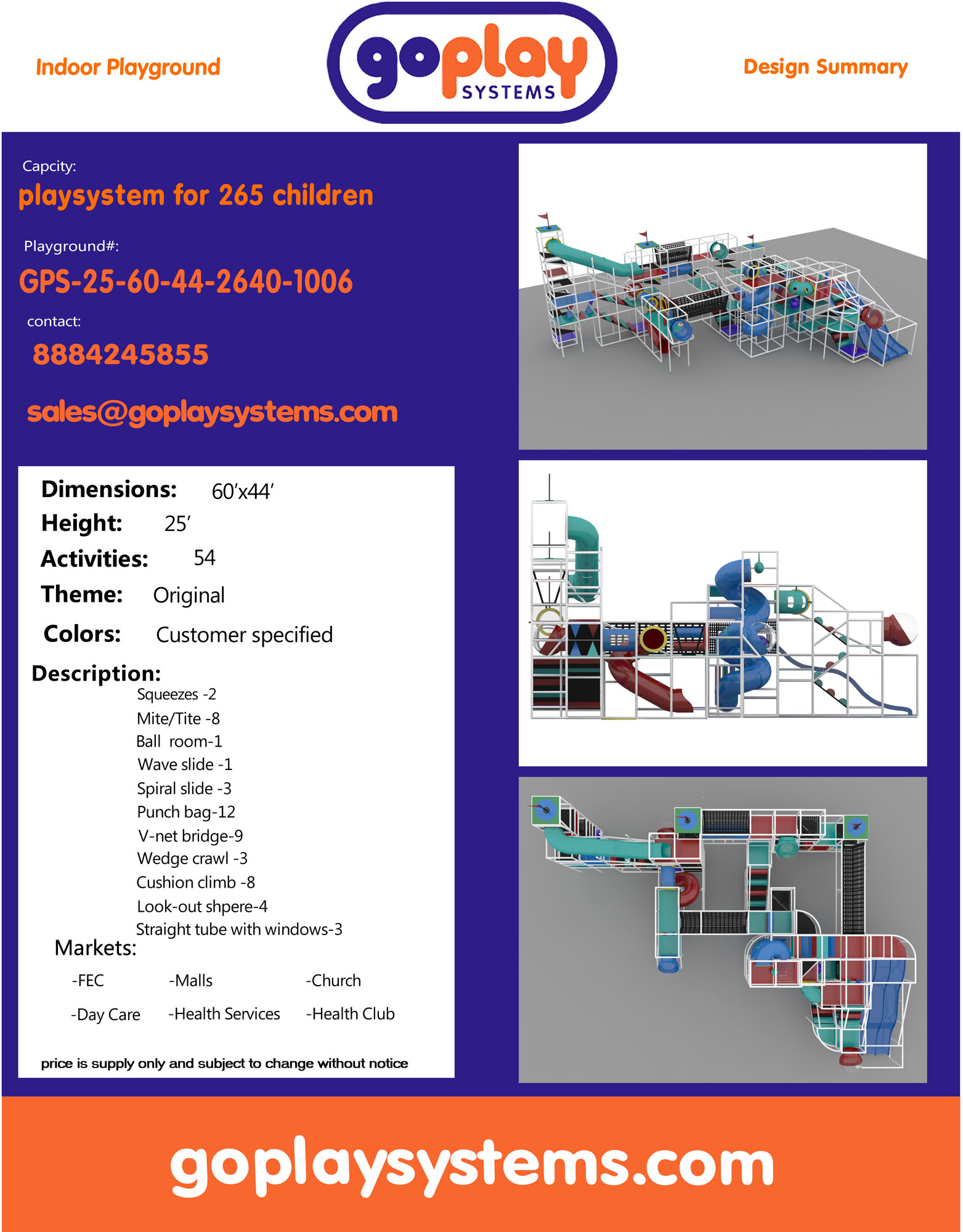 Indoor Playground GPS1006 is a custom designed module soft play system. The playground system measures 25 ft. H x 60 ft. W x 44 ft.