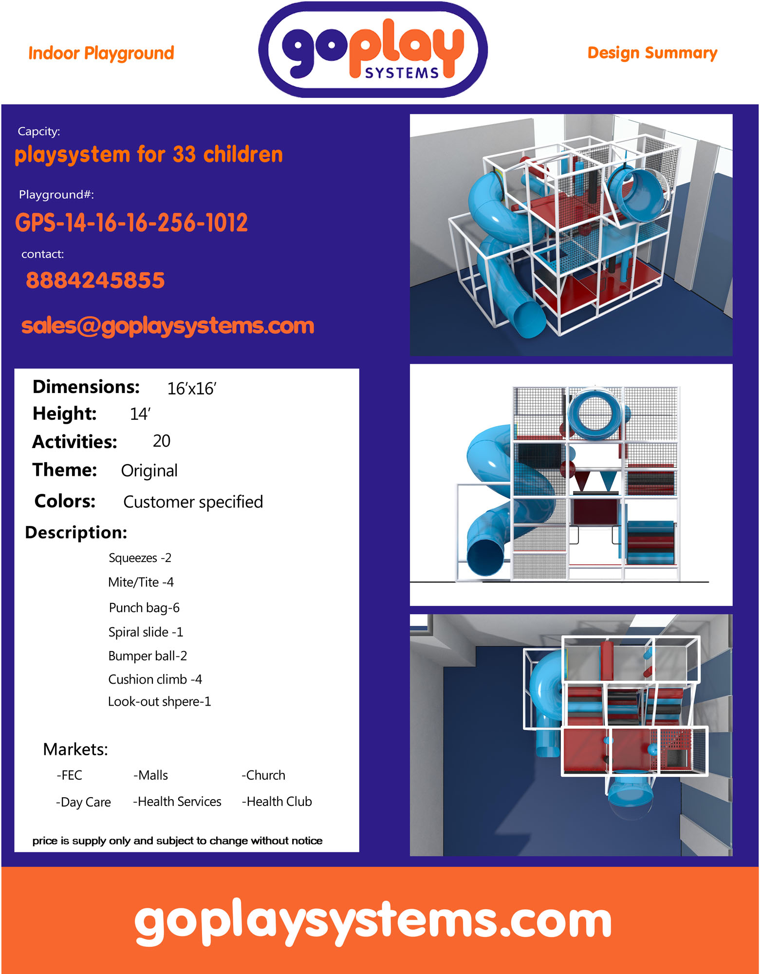 Indoor Playground GPS1012 is a custom designed modular soft play system developed to safely accommodate children. The playground system measures 16 ft. wide by 14 ft. high and a length of 16 ft. The minimum indoor room space required for this playground is approximately 22 ft. room width with a 16 ft. ceiling and 22 ft. room length. Medium Size Indoor Playground.