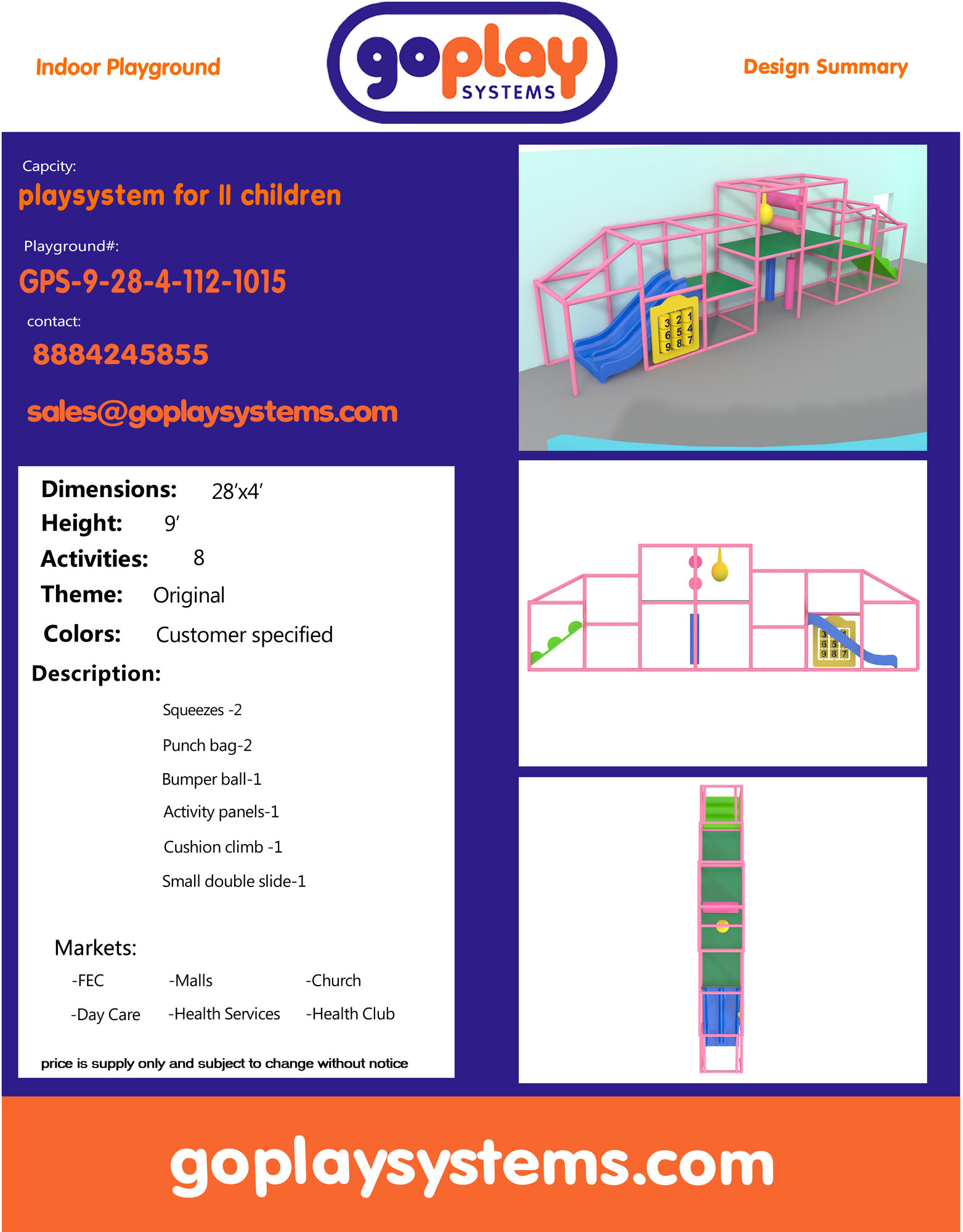 Indoor Playground GPS1015 is a custom designed module soft play system. The playground system measures 9 ft. H x 28 ft. W x 4 ft.