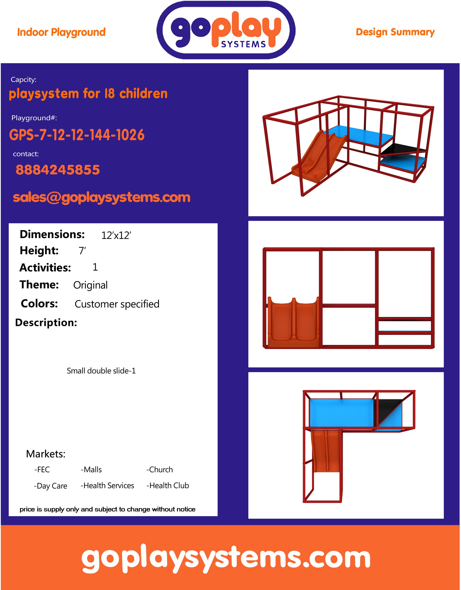 Indoor Playground GPS1026 is a custom designed modular soft play system developed to safely accommodate children. The playground system measures 12 ft. wide by 7 ft. high and a length of 12 ft. The minimum indoor room space required for this playground is approximately 18 ft. room width with a 9 ft. ceiling and 18 ft. room length. Small Size Indoor Playground.
