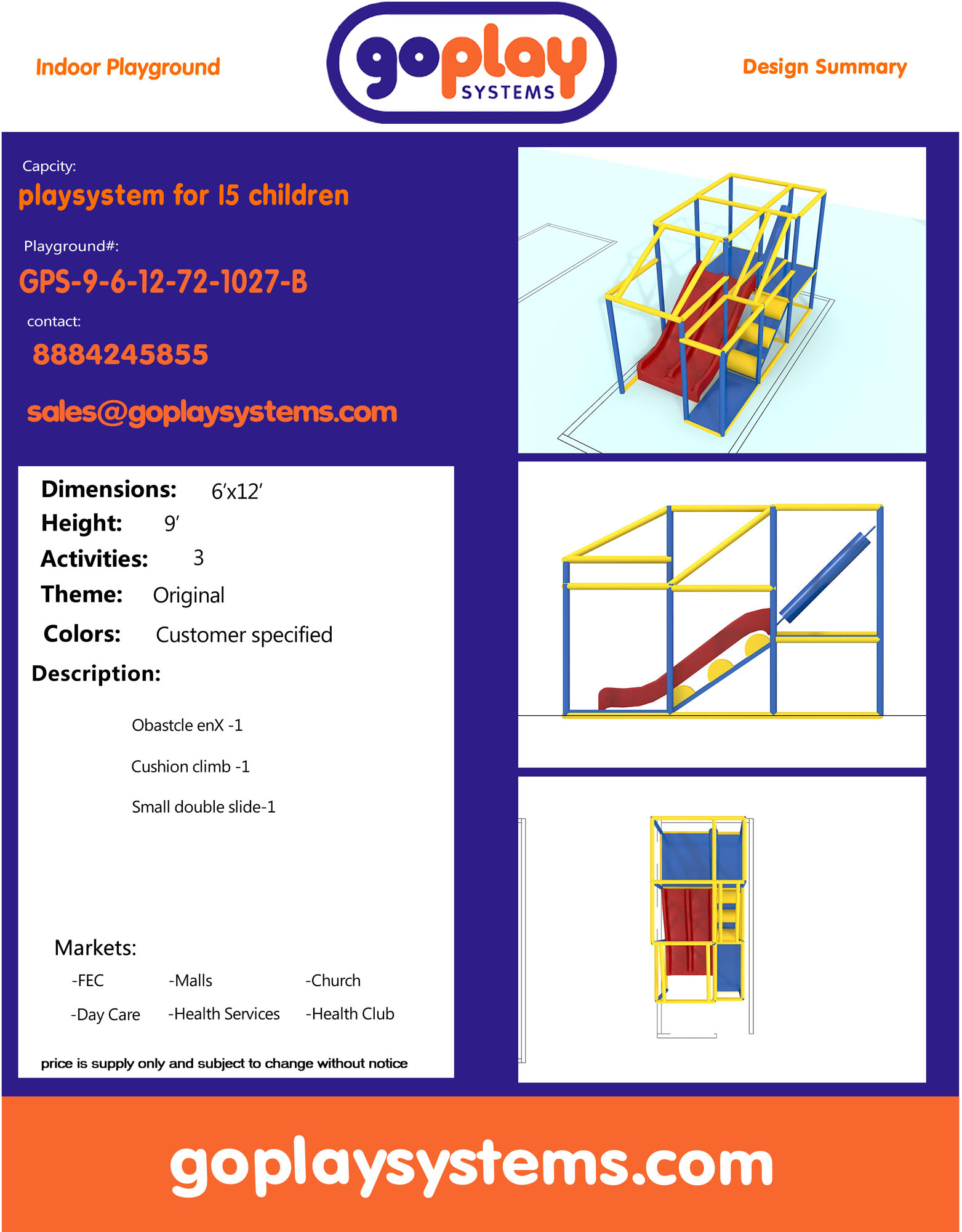 Availability: In-stock Brand: Go Play Systems SKU: GPS-9-6-12-72-1027B Shipping: Free Shipping US to lower 48 states. Shipping Policy Return and Refund Policy *GoPlay sells worldwide. Prices may not include additional shipping and handling charges to your specific location. Contact us for current international shipping rates.