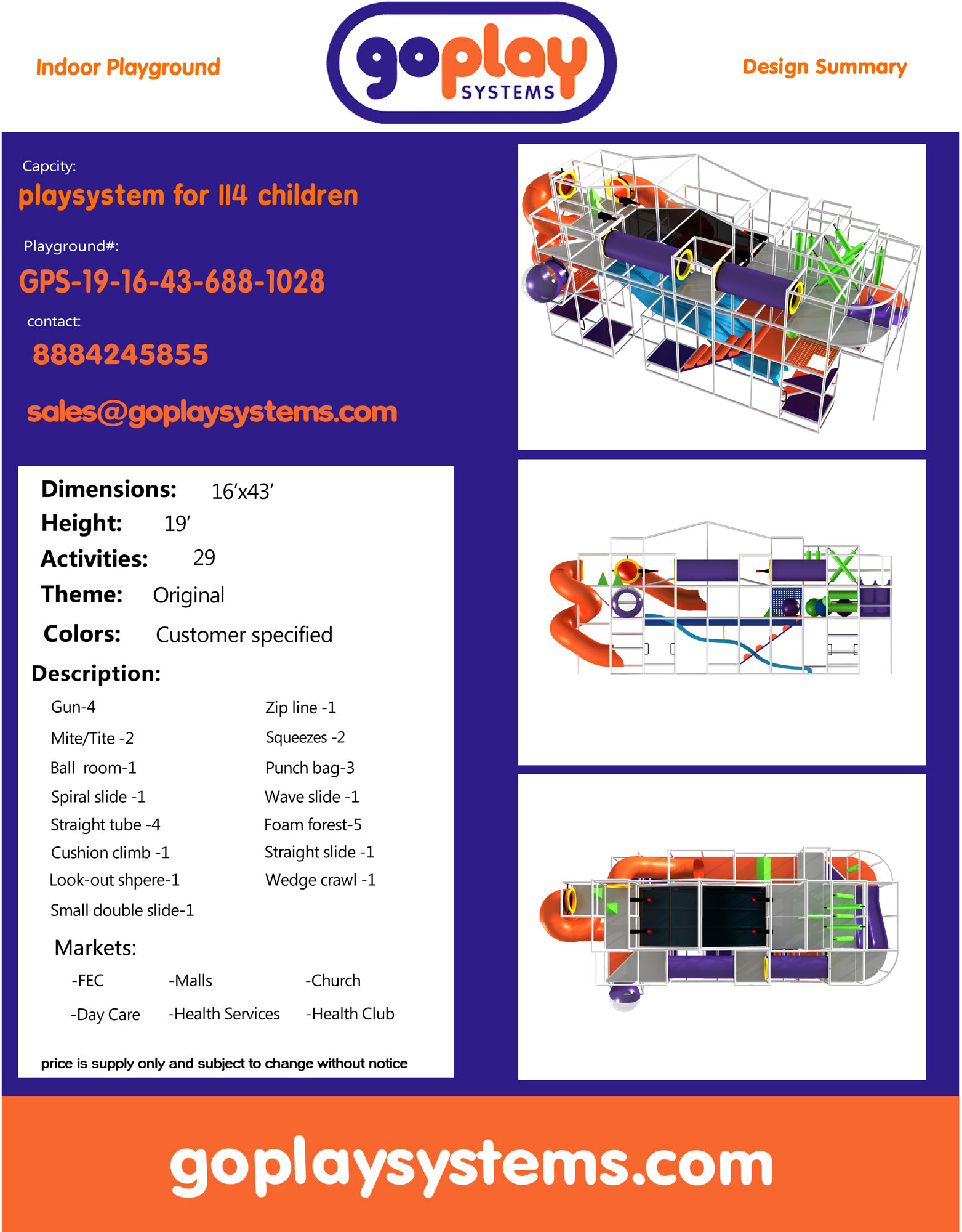 Indoor Playground GPS1028 is a custom designed module soft play system. The playground system measures 19 ft. H x 16 ft. W x 43 ft.