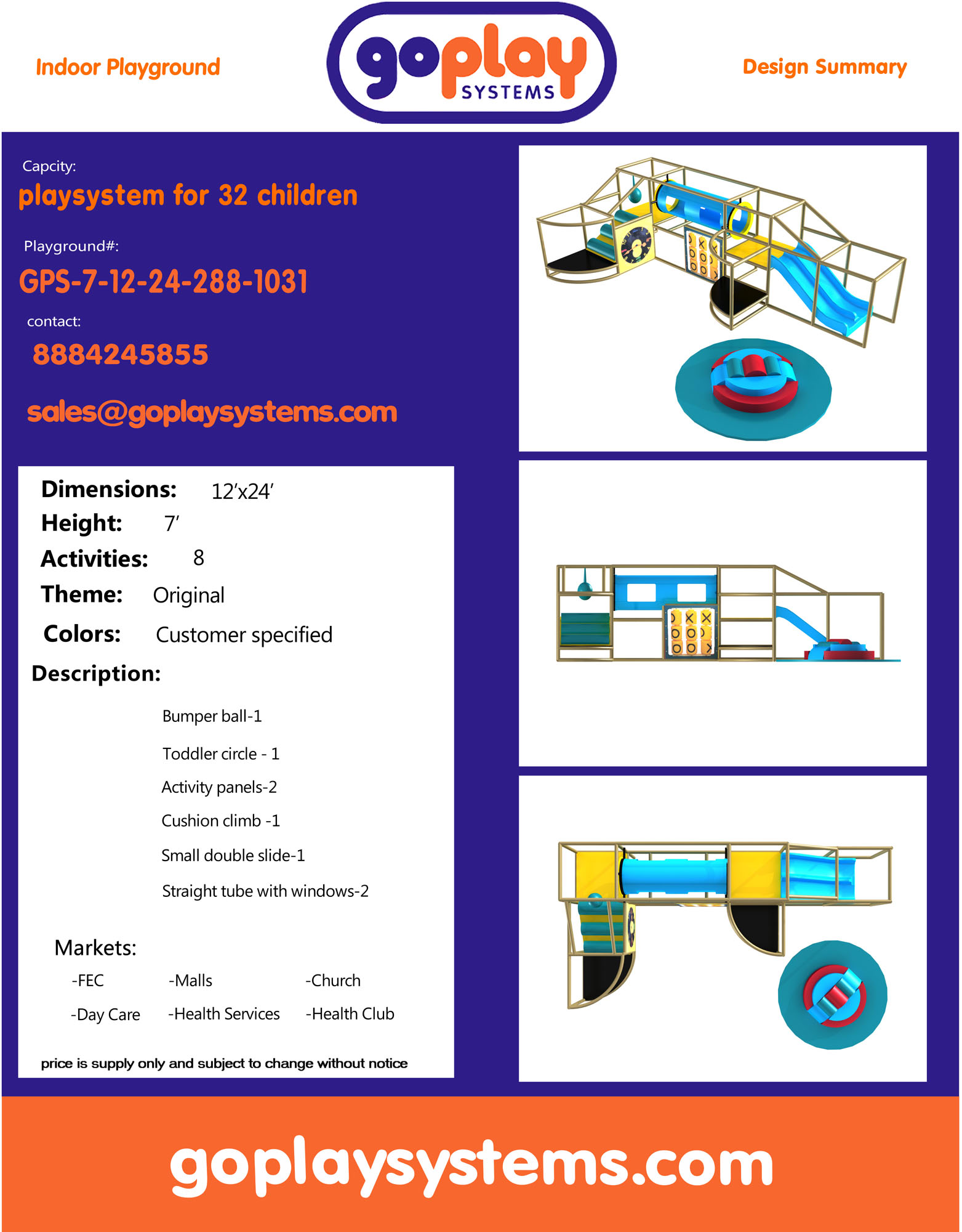 Indoor Playground GPS1031 is a custom designed module soft play system. The playground system measures 7 ft. H x 12 ft. W x 24 ft.