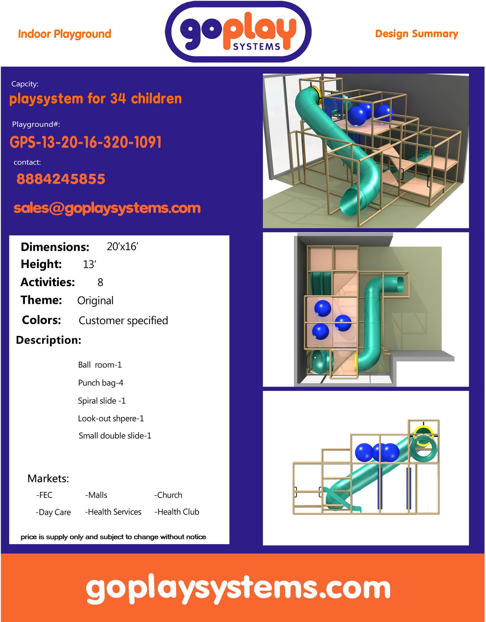 Indoor Playground GPS1091 is a custom designed module soft play system. The playground system measures 13 ft. H x 20 ft. W x 16 ft.