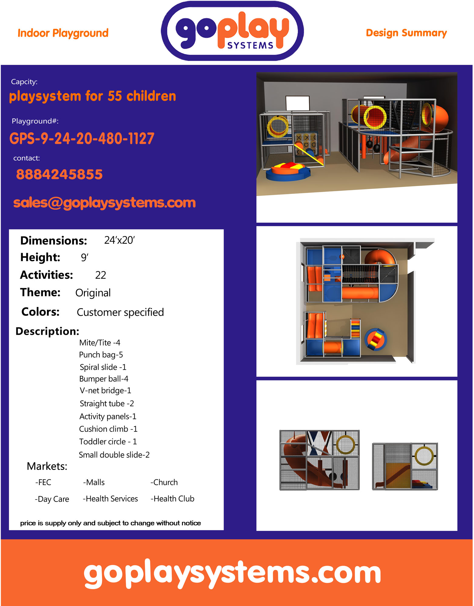 Indoor Playground GPS1127 is a custom designed module soft play system. The playground system measures 9 ft. H x 24 ft. W x 20 ft.