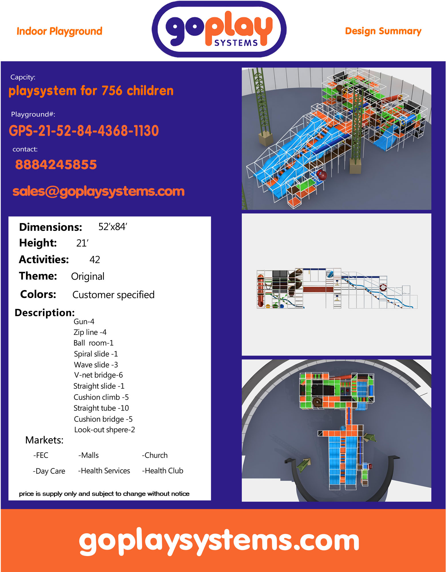 Indoor Playground GPS1130 is a custom designed module soft play system. The playground system measures 21 ft. H x 52 ft. W x 84 ft.