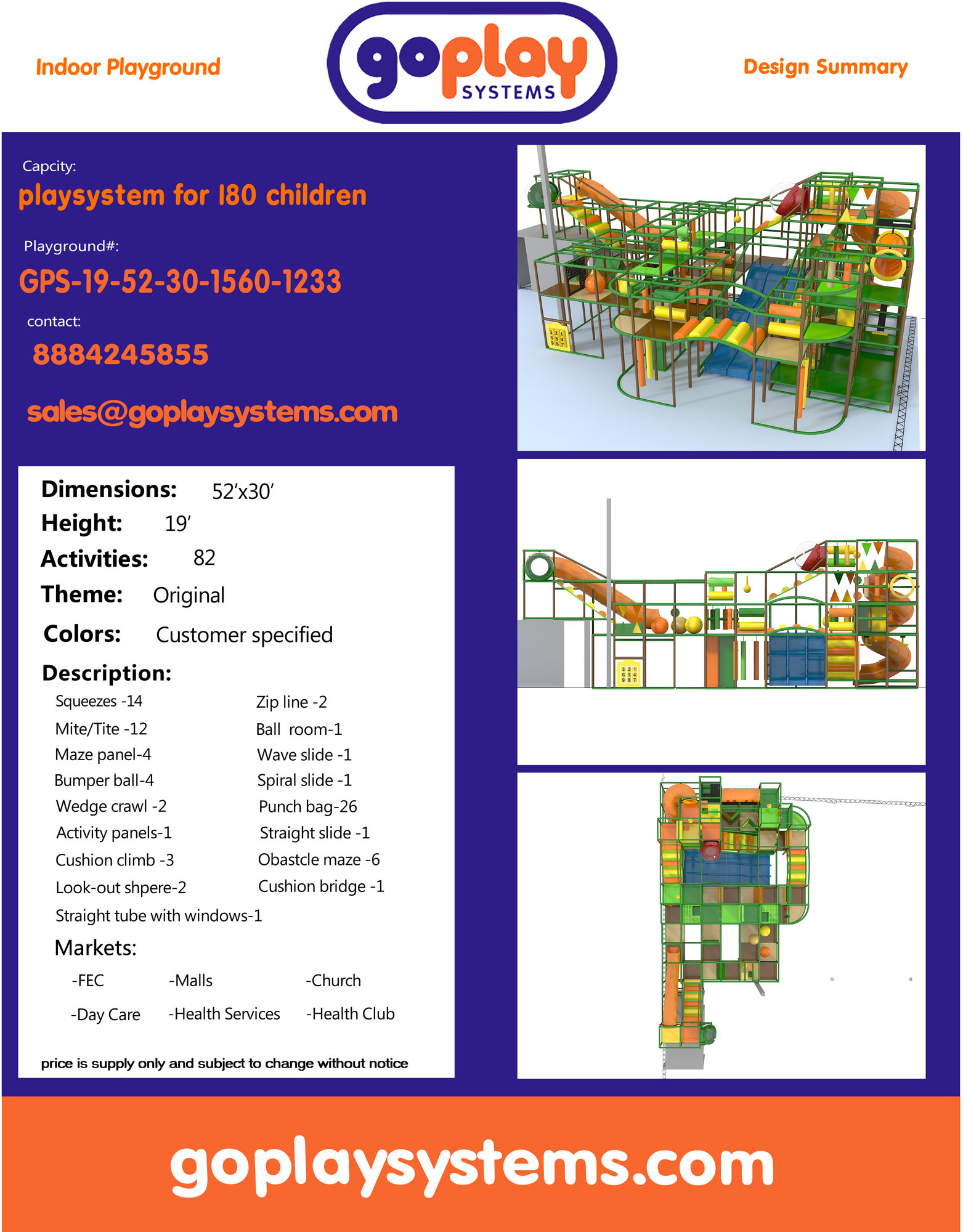 Indoor Playground GPS1233 is a custom indoor playsystem for children three to twelve years of age. The softplay unit measures 52 ft. wide by 19 ft. high and a length of 30 ft. The minimum room space required for this children’s play equipment is approximately 58 ft. room width with a 21 ft. ceiling and 36 ft. room length. Total area: 1560 sq ft. Large Size Indoor Playground.