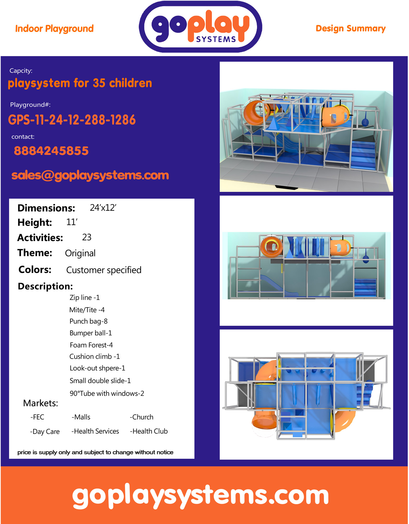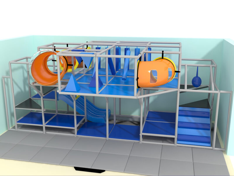 Indoor Playground GPS1286 is a custom indoor playsystem for children three to twelve years of age. The softplay unit measures 24 ft. wide by 11 ft. high and a length of 12 ft. The minimum room space required for this children’s play equipment is approximately 30 ft. room width with a 13 ft. ceiling and 18 ft. room length. Total area: 288 sq ft. Medium Size Indoor Playground.