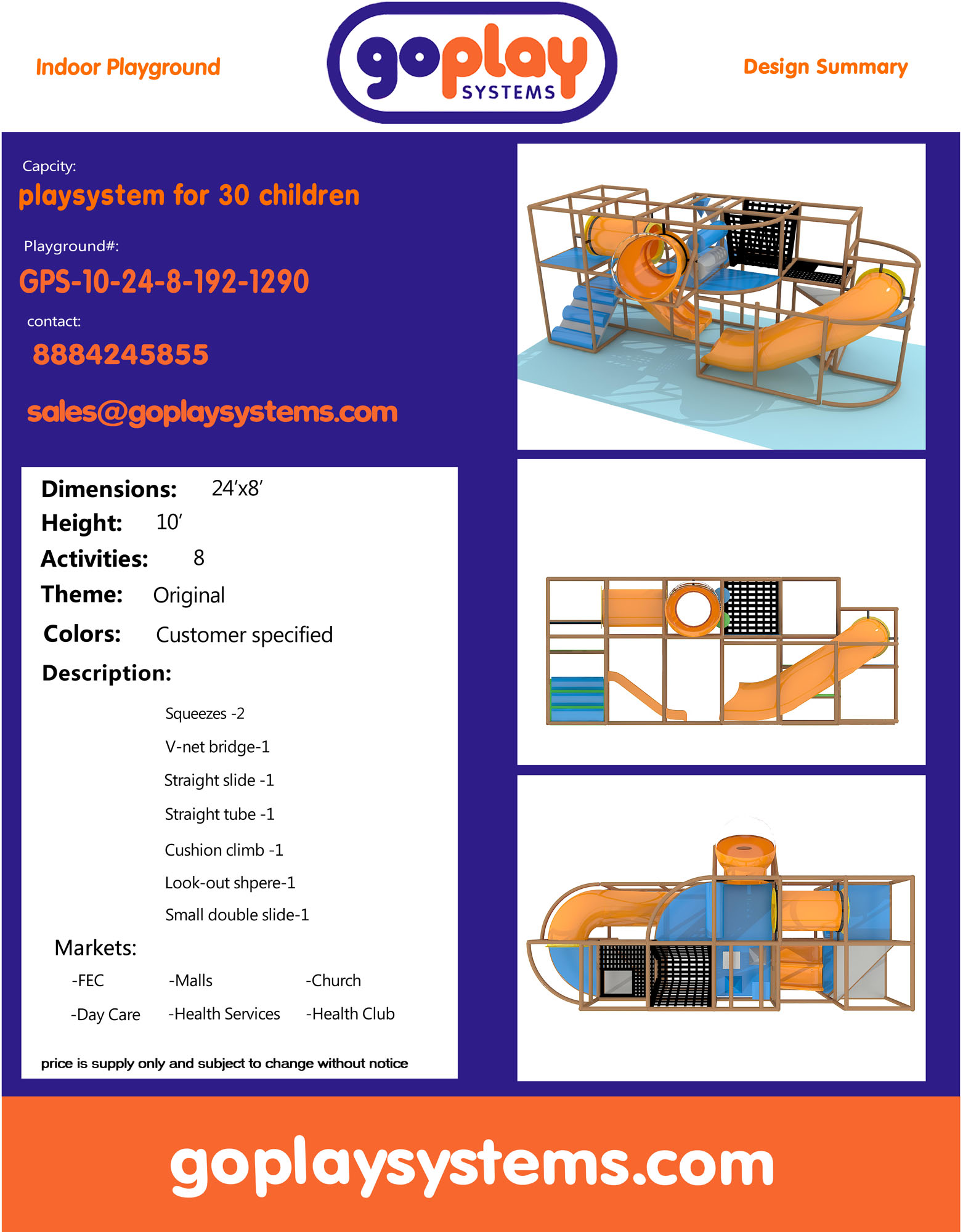Indoor Playground GPS1290 is a custom indoor playsystem for children three to twelve years of age. The softplay unit measures 24 ft. wide by 10 ft. high and a length of 8 ft. The minimum room space required for this children’s play equipment is approximately 30 ft. room width with a 12 ft. ceiling and 14 ft. room length. Total area: 192 sq ft. Small Size Indoor Playground.
