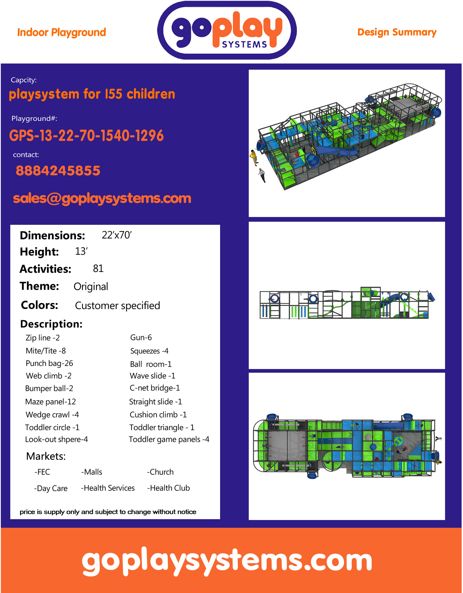 Indoor Playground GPS1296 is a custom indoor playsystem for children three to twelve years of age. The softplay unit measures 22 ft. wide by 13 ft. high and a length of 70 ft. The minimum room space required for this children’s play equipment is approximately 28 ft. room width with a 15 ft. ceiling and 76 ft. room length. Total area: 1540 sq ft. Medium Size Indoor Playground.