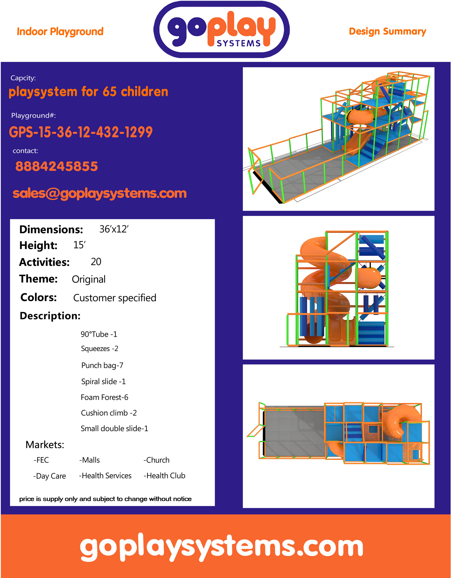 Indoor Playground GPS1299 is a custom indoor playsystem for children three to twelve years of age. The softplay unit measures 36 ft. wide by 15 ft. high and a length of 12 ft. The minimum room space required for this children’s play equipment is approximately 42 ft. room width with a 17 ft. ceiling and 18 ft. room length. Total area: 432 sq ft. Medium Size Indoor Playground.
