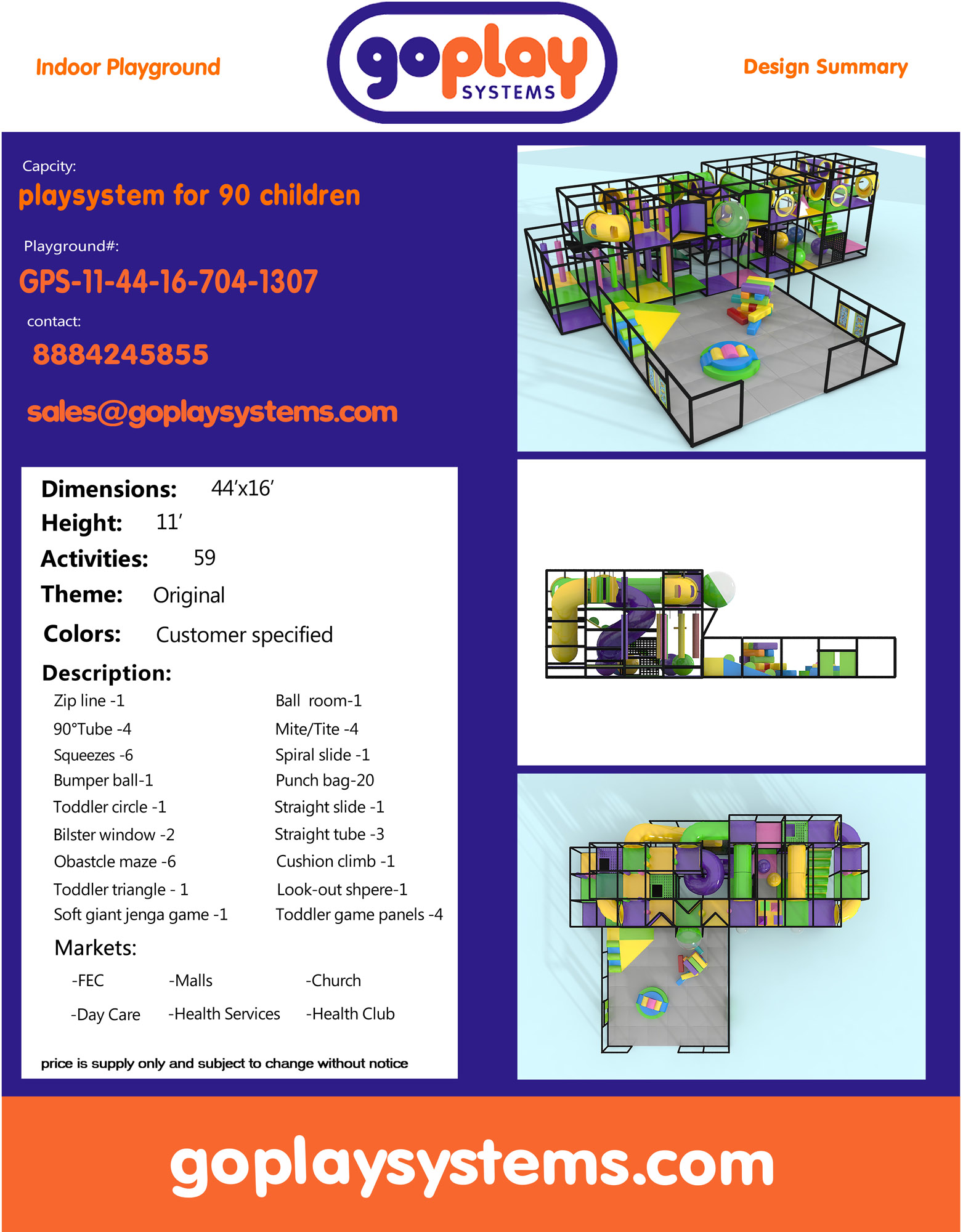 Indoor Playground GPS1307 is a custom indoor playsystem for children three to twelve years of age. The softplay unit measures 44 ft. wide by 11 ft. high and a length of 16 ft. The minimum room space required for this children’s play equipment is approximately 50 ft. room width with a 13 ft. ceiling and 22 ft. room length. Total area: 704 sq ft. Medium Size Indoor Playground.