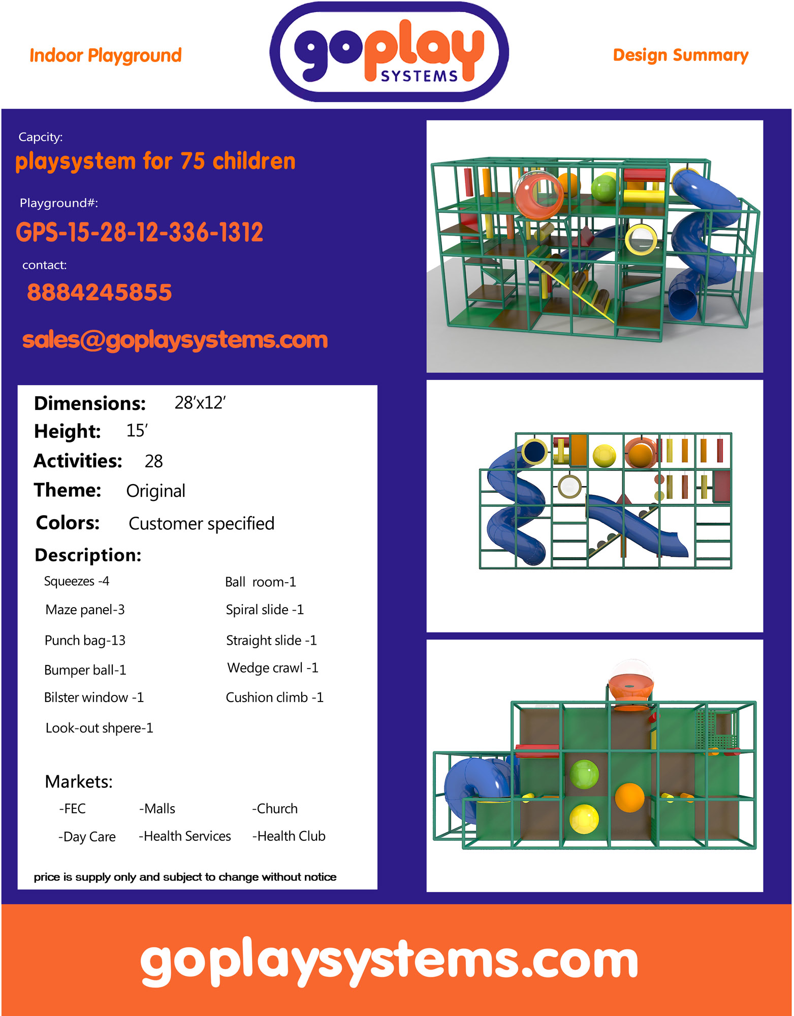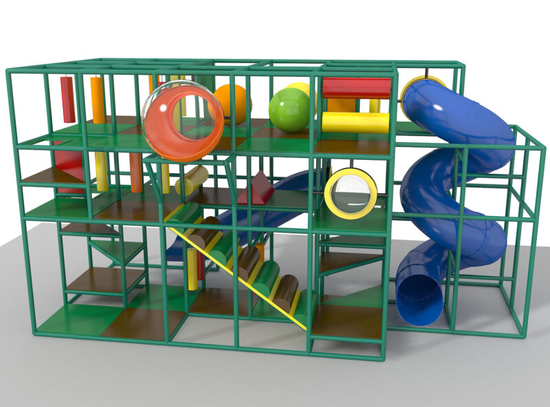 Indoor Playground GPS1312 is a custom indoor playsystem for children three to twelve years of age. The softplay unit measures 28 ft. wide by 15 ft. high and a length of 12 ft. The minimum room space required for this children’s play equipment is approximately 34 ft. room width with a 17 ft. ceiling and 18 ft. room length. Total area: 336 sq ft. Medium Size Indoor Playground.