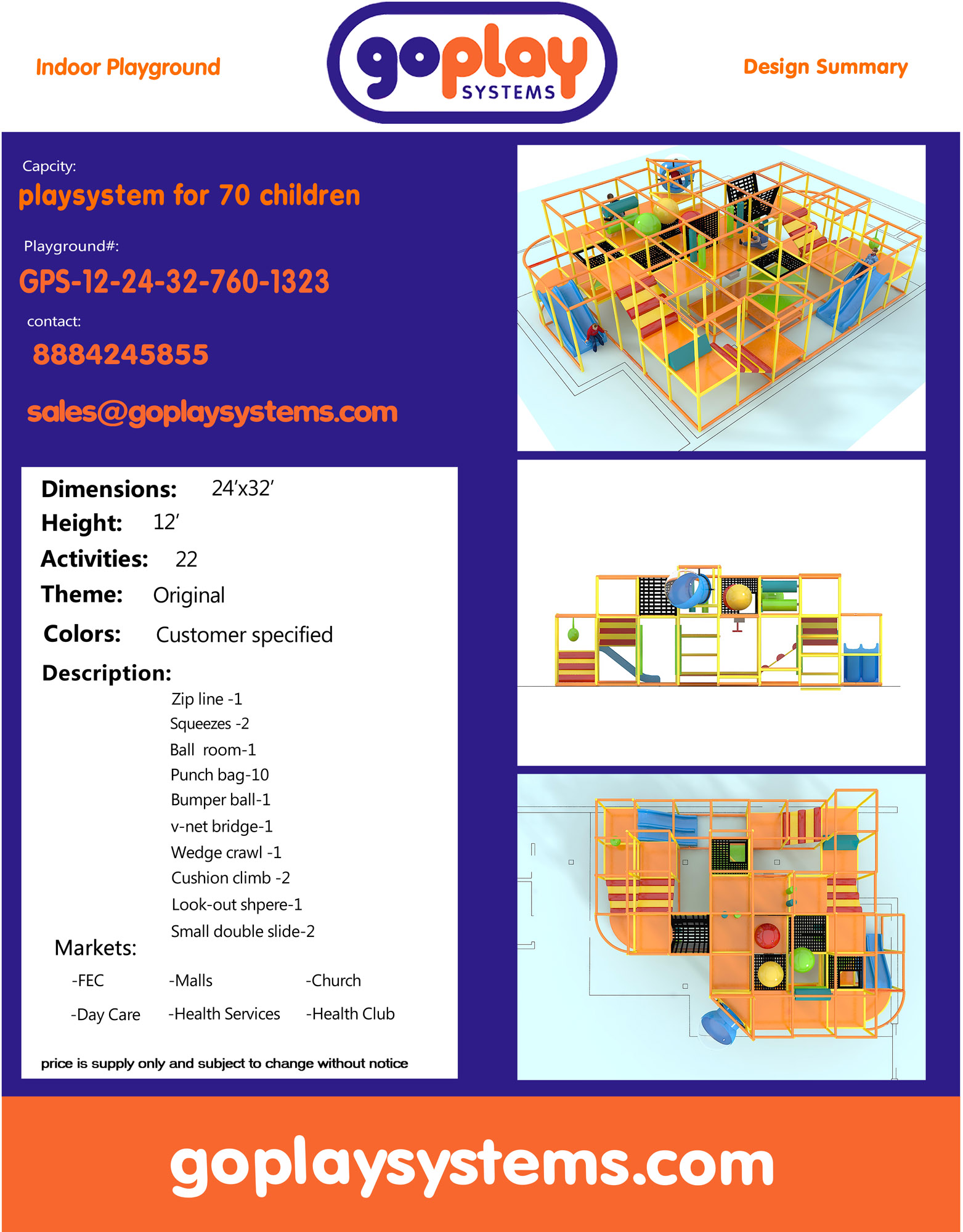 Indoor Playground GPS1323 is a custom indoor playsystem for children three to twelve years of age. The softplay unit measures 24 ft. wide by 12 ft. high and a length of 32 ft. The minimum room space required for this children’s play equipment is approximately 30 ft. room width with a 14 ft. ceiling and 38 ft. room length. Total area: 760 sq ft. Medium Size Indoor Playground.