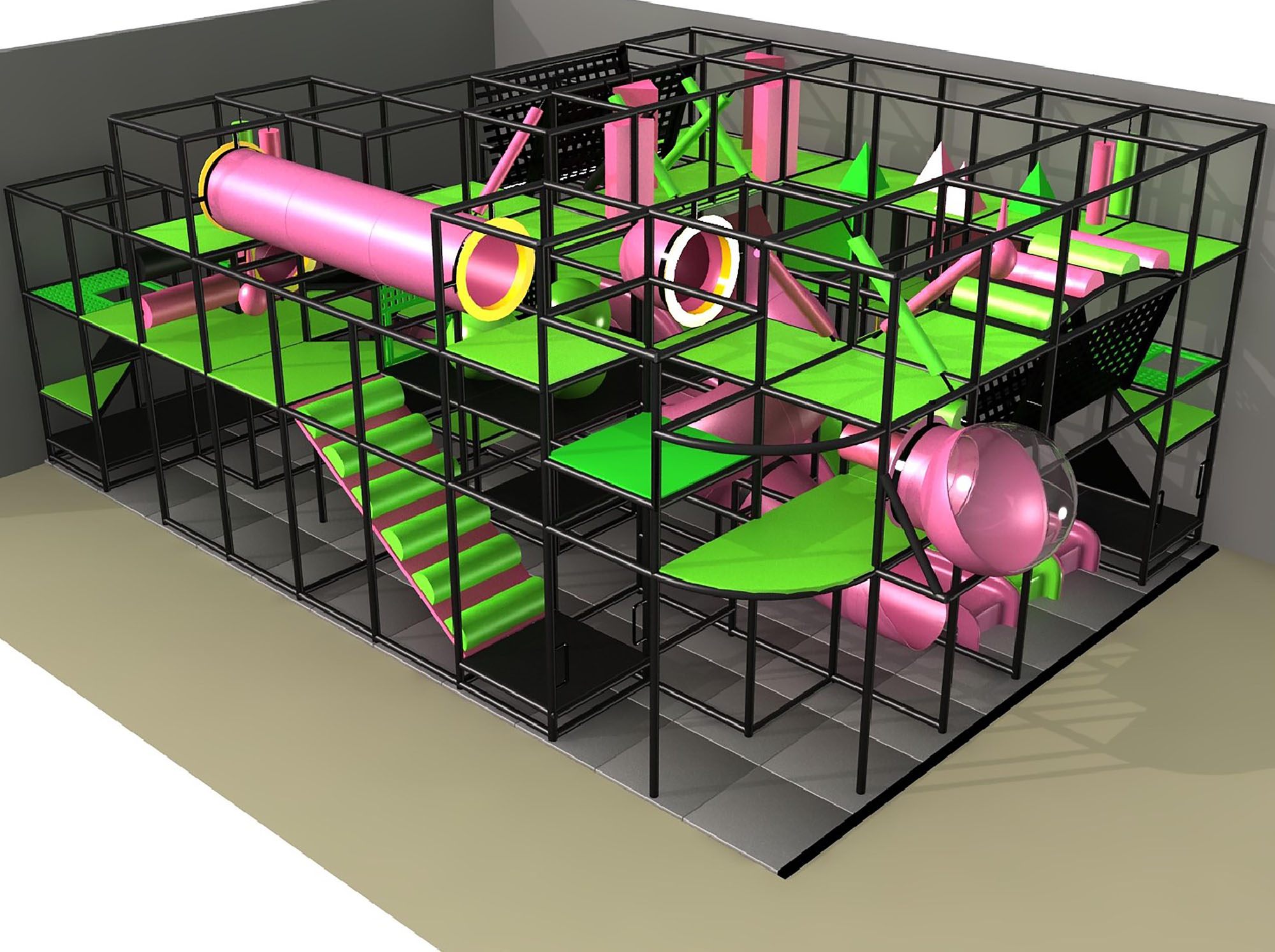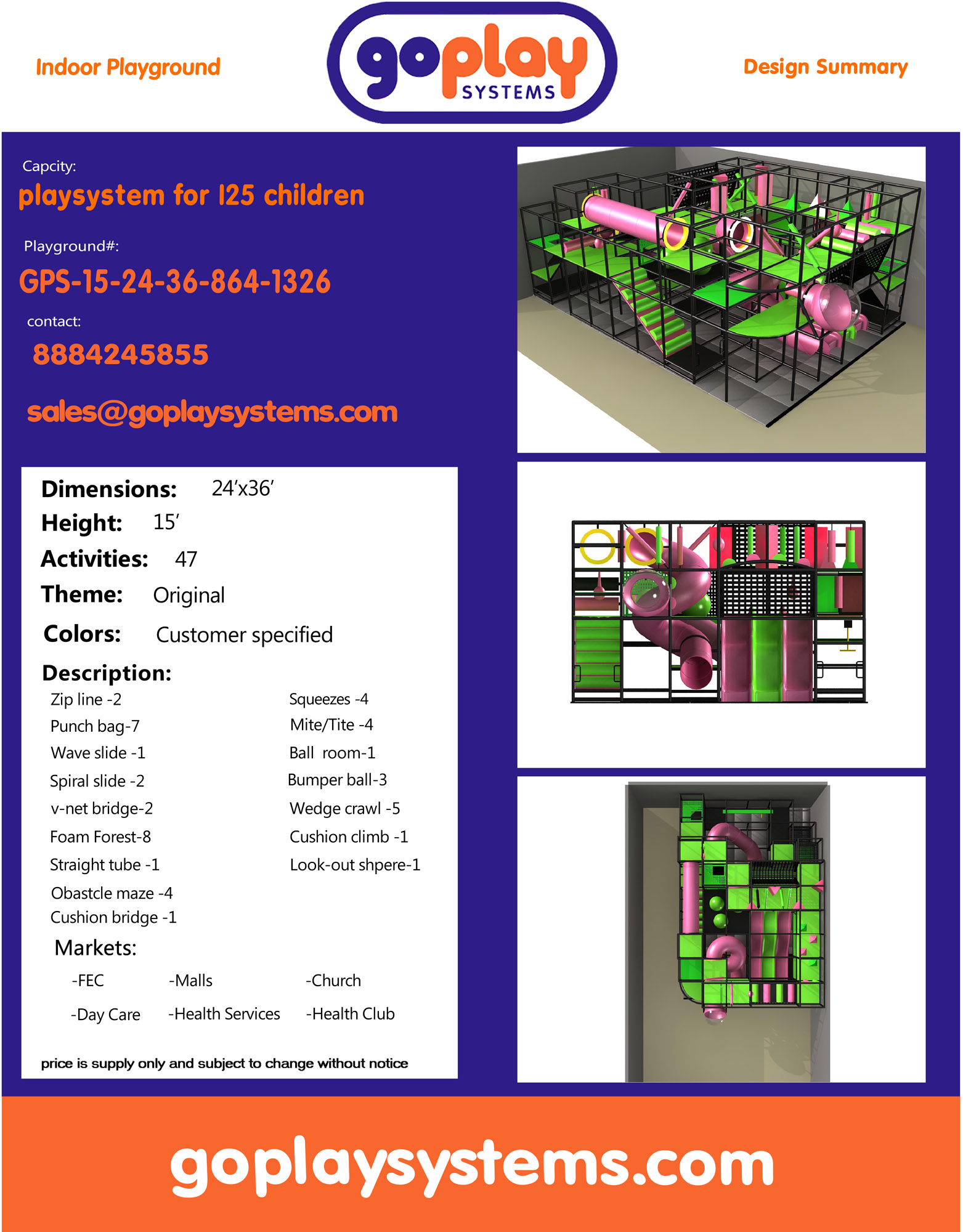 Indoor Playground GPS1326 is a custom indoor playsystem for children three to twelve years of age. The softplay unit measures 24 ft. wide by 15 ft. high and a length of 36 ft. The minimum room space required for this children’s play equipment is approximately 30 ft. room width with a 17 ft. ceiling and 42 ft. room length. Total area: 864 sq ft. Medium-Large Size Indoor Playground.