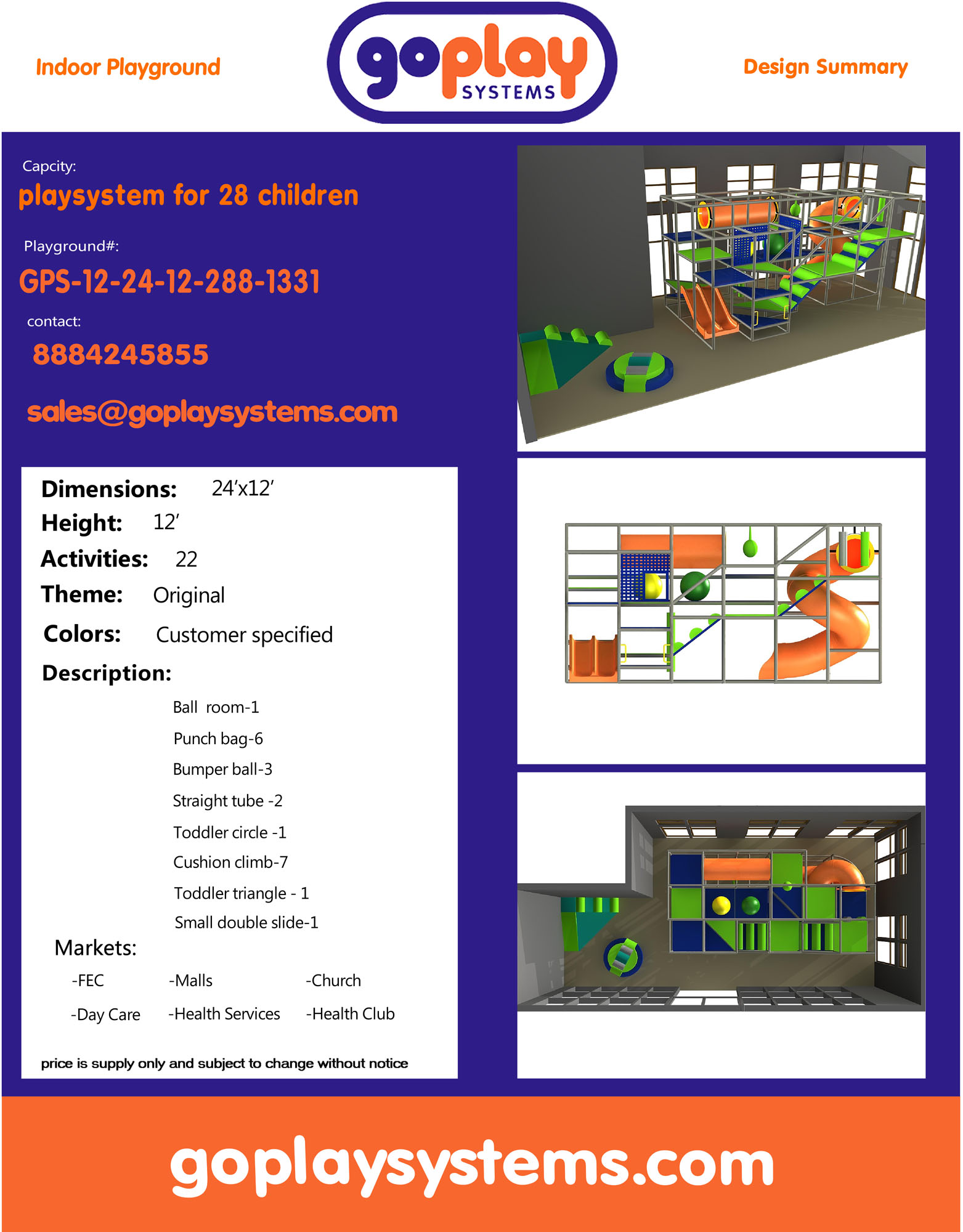 Indoor Playground GPS1331 is a custom indoor playsystem for children three to twelve years of age. The softplay unit measures 12 ft. wide by 12 ft. high and a length of 24 ft. The minimum room space required for this children’s play equipment is approximately 18 ft. room width with a 14 ft. ceiling and 30 ft. room length. Total area: 288 sq ft. Medium Size Indoor Playground.
