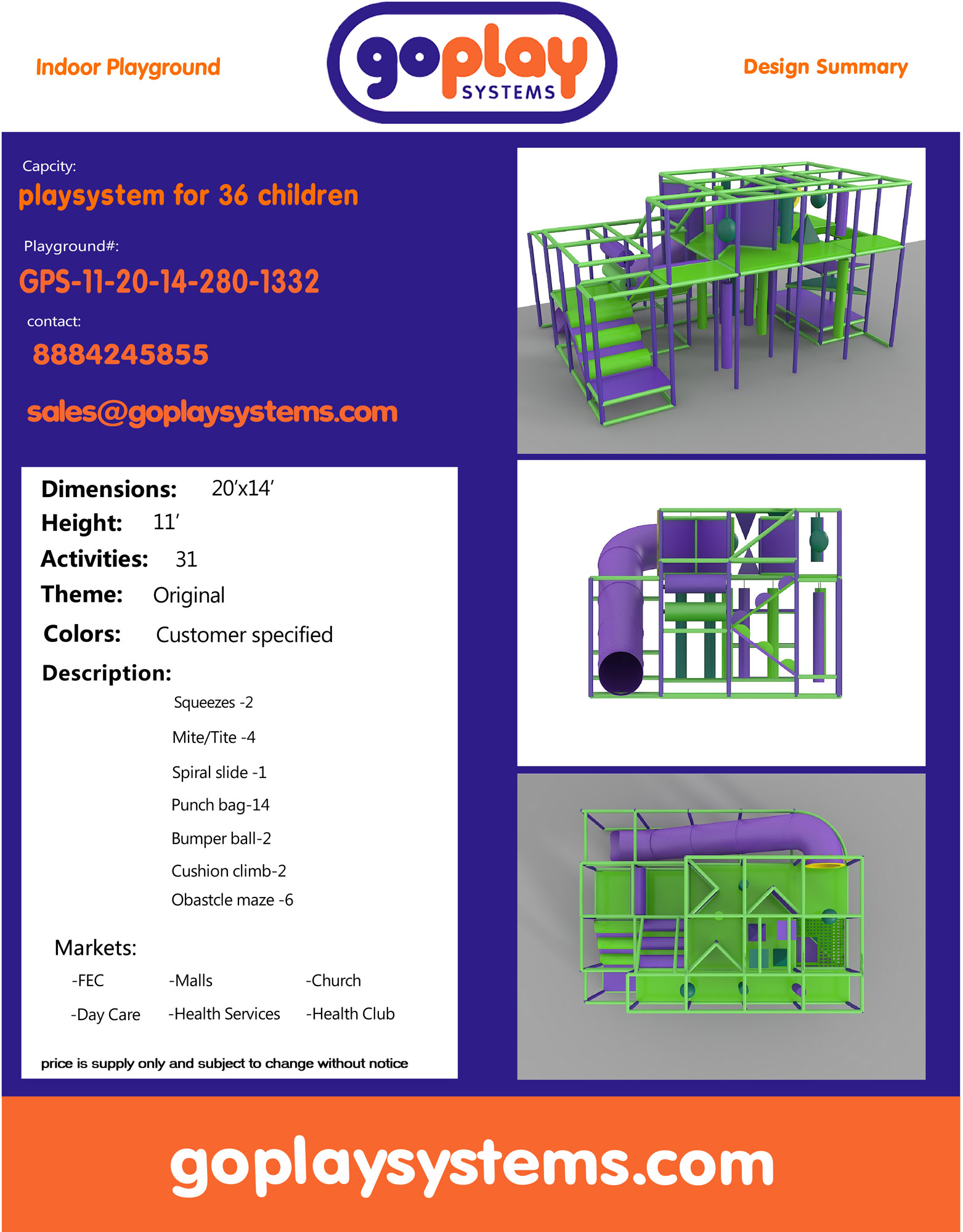 Indoor Playground GPS1332 is a custom indoor playsystem for children three to twelve years of age. The softplay unit measures 20 ft. wide by 11 ft. high and a length of 14 ft. The minimum room space required for this children’s play equipment is approximately 26 ft. room width with a 13 ft. ceiling and 20 ft. room length. Total area: 280 sq ft. Medium Size Indoor Playground.