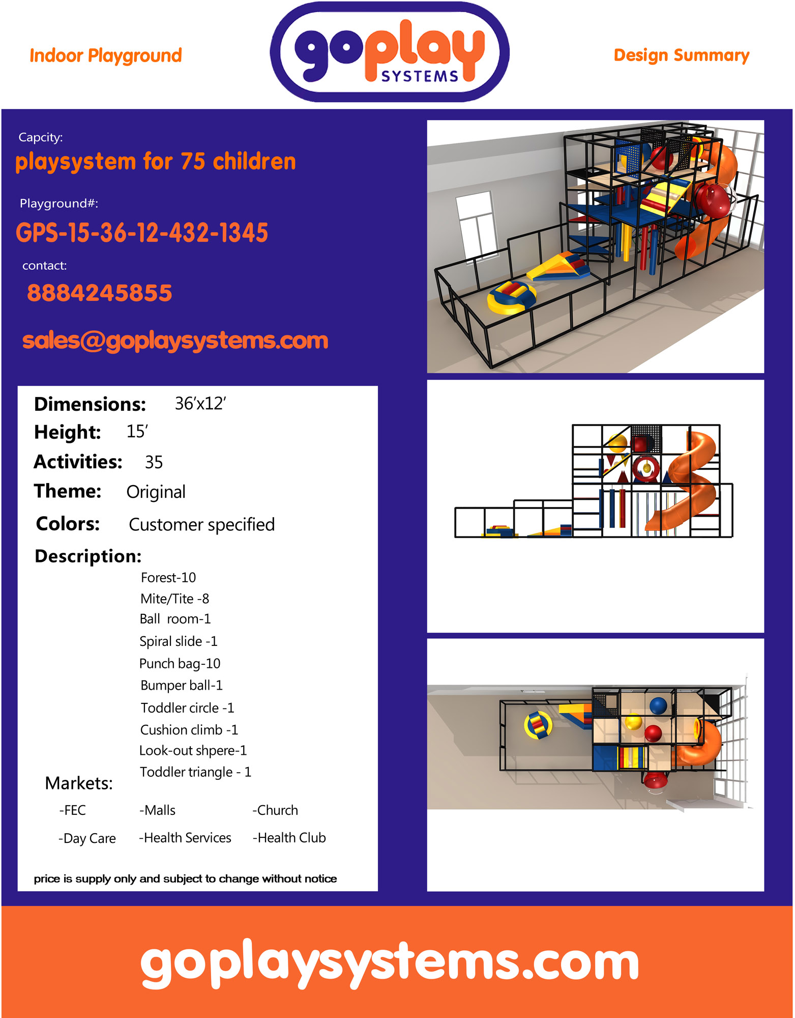 Indoor Playground GPS1345 is a custom indoor playsystem for children three to twelve years of age. The softplay unit measures 36 ft. wide by 15 ft. high and a length of 12 ft. The minimum room space required for this children’s play equipment is approximately 42 ft. room width with a 17 ft. ceiling and 18 ft. room length. Total area: 432 sq ft. Medium Size Indoor Playground.