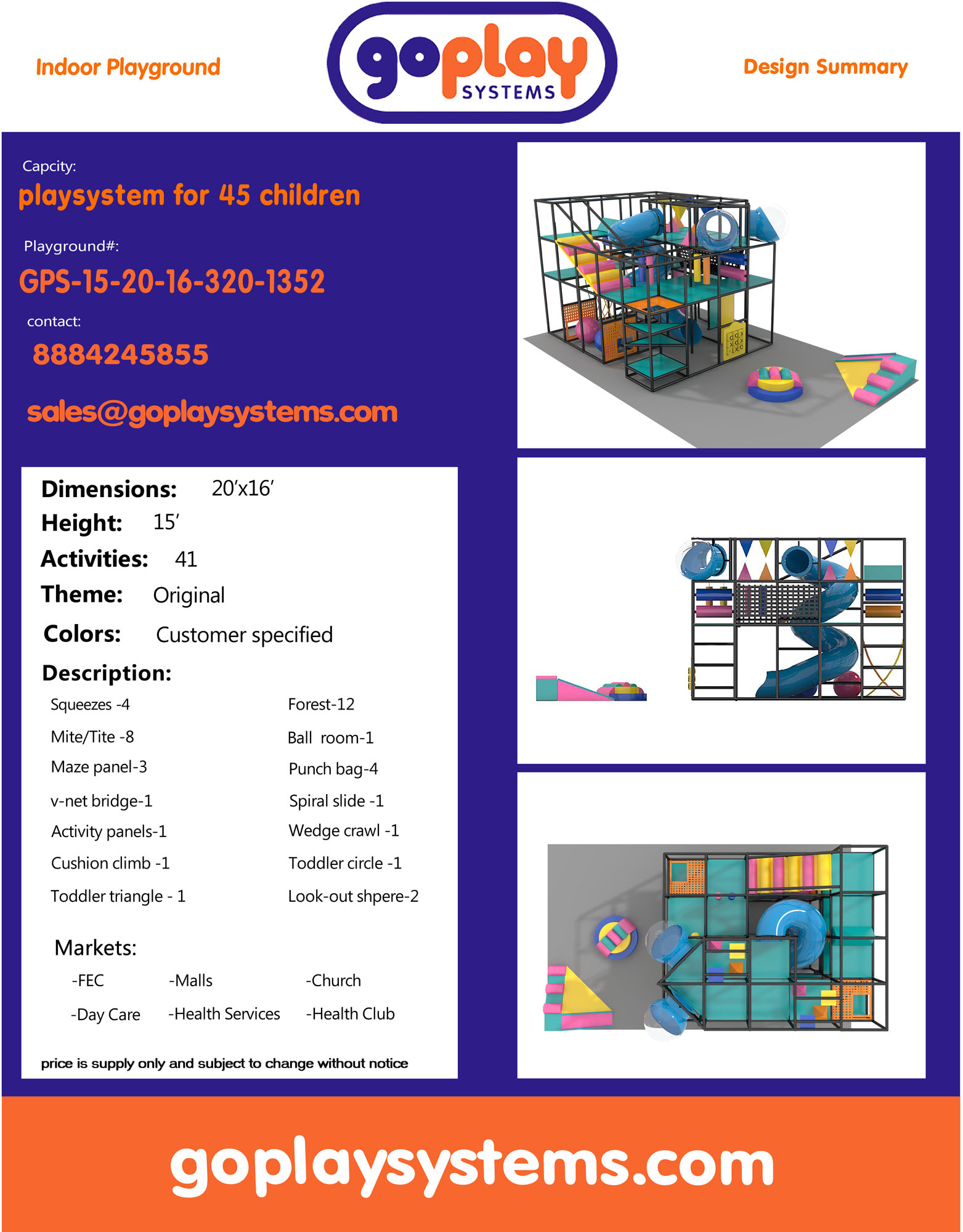 Indoor Playground GPS1352 is a custom indoor playsystem for children three to twelve years of age. The softplay unit measures 20 ft. wide by 15 ft. high and a length of 16 ft. The minimum room space required for this children’s play equipment is approximately 26 ft. room width with a 17 ft. ceiling and 22 ft. room length. Medium Size Indoor Playground.