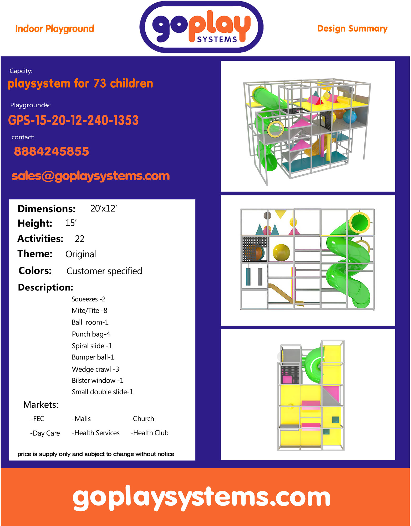 Indoor Playground GPS1353 is a custom indoor playsystem for children three to twelve years of age. The softplay unit measures 20 ft. wide by 15 ft. high and a length of 12 ft. The minimum room space required for this children’s play equipment is approximately 26 ft. room width with a 17 ft. ceiling and 18 ft. room length. Total area: 240 sq ft. Medium Size Indoor Playground.