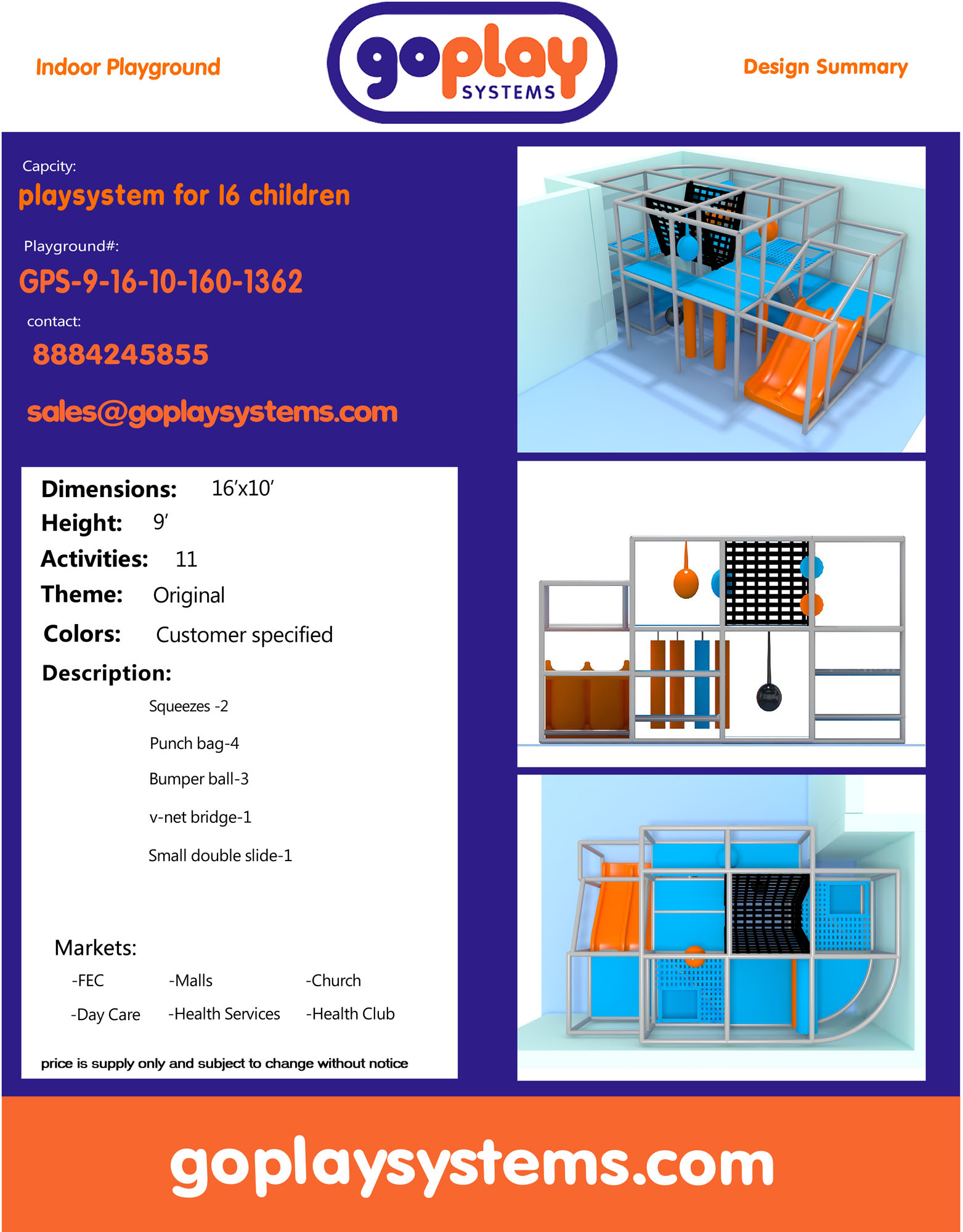Indoor Playground GPS1362 is a custom indoor playsystem for children three to twelve years of age. The softplay unit measures 16 ft. wide by 9 ft. high and a length of 10 ft. The minimum room space required for this children’s play equipment is approximately 22 ft. room width with a 11 ft. ceiling and 16 ft. room length. Total area: 160 sq ft. Small Size Indoor Playground.