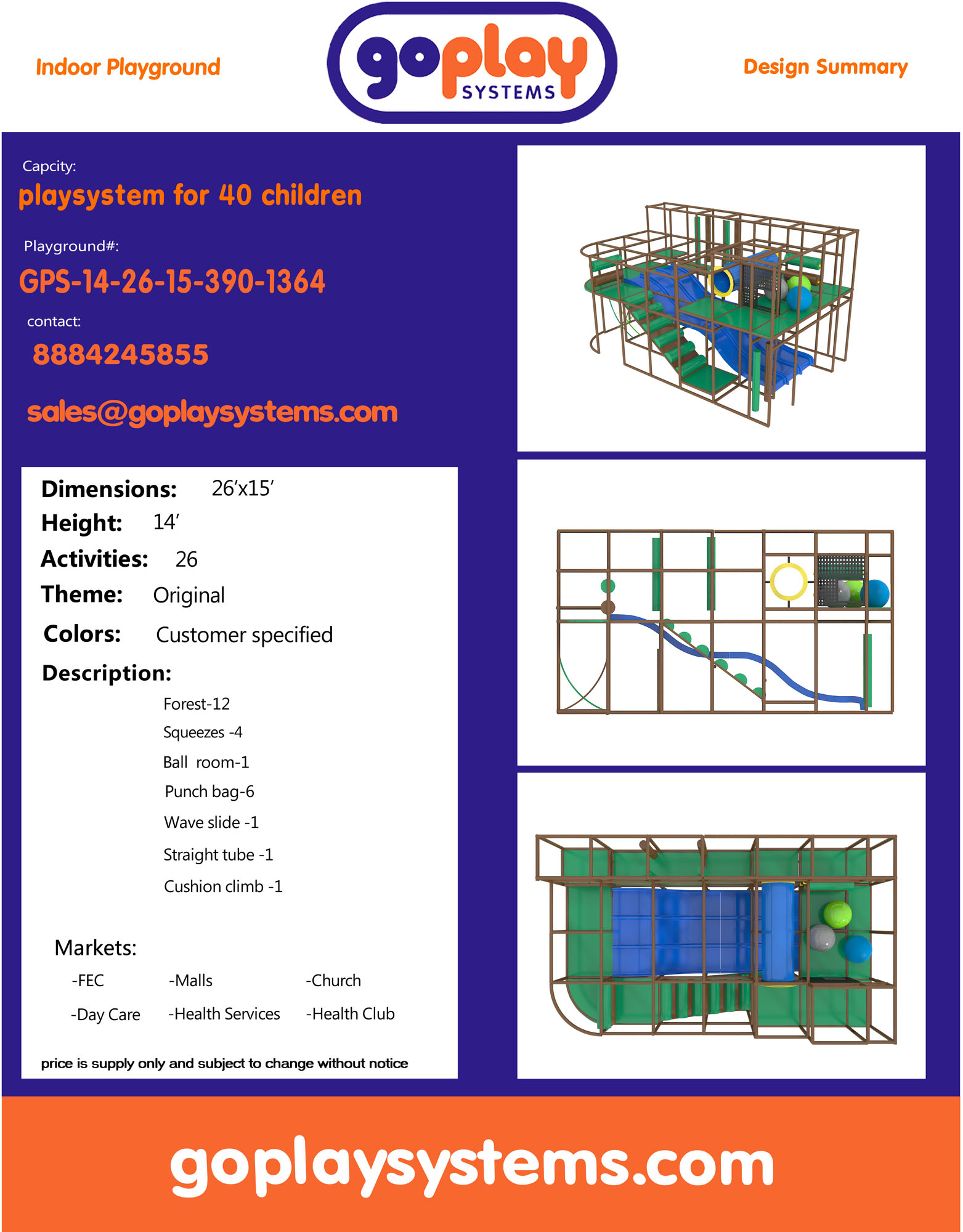 Indoor Playground GPS1364 is a custom indoor playsystem for children three to twelve years of age. The softplay unit measures 26 ft. wide by 14 ft. high and a length of 15 ft. The minimum room space required for this children’s play equipment is approximately 32 ft. room width with a 16 ft. ceiling and 21 ft. room length. Total area: 390 sq ft. Medium Size Indoor Playground.