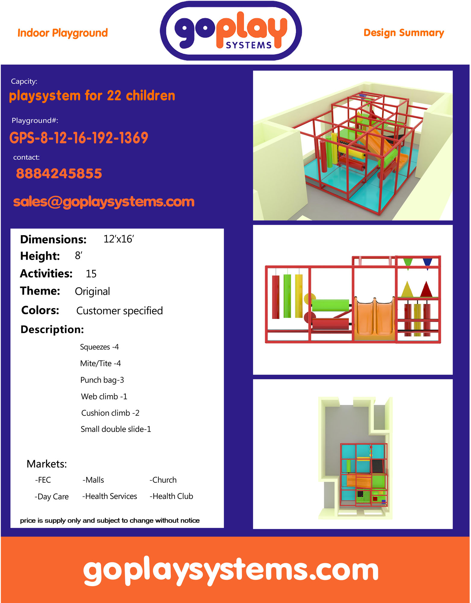 Indoor Playground GPS1369 is a custom indoor playsystem for children three to twelve years of age. The softplay unit measures 16 ft. wide by 8 ft. high and a length of 12 ft. The minimum room space required for this children’s play equipment is approximately 22 ft. room width with a 10 ft. ceiling and 18 ft. room length. Total area: 192 sq ft. Small Size Indoor Playground.