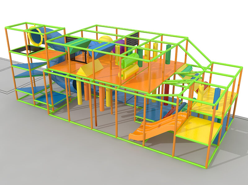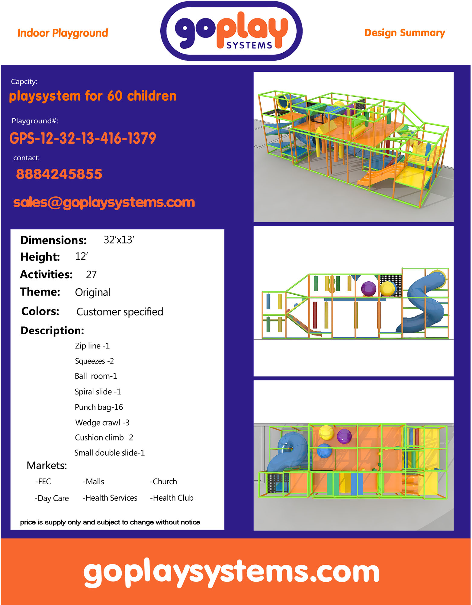 Indoor Playground GPS1379 is a custom indoor playsystem for children three to twelve years of age. The softplay unit measures 32 ft. wide by 12 ft. high and a length of 13 ft. The minimum room space required for this children’s play equipment is approximately 38 ft. room width with a 14 ft. ceiling and 19 ft. room length. Total area: 416 sq ft. Medium Size Indoor Playground.