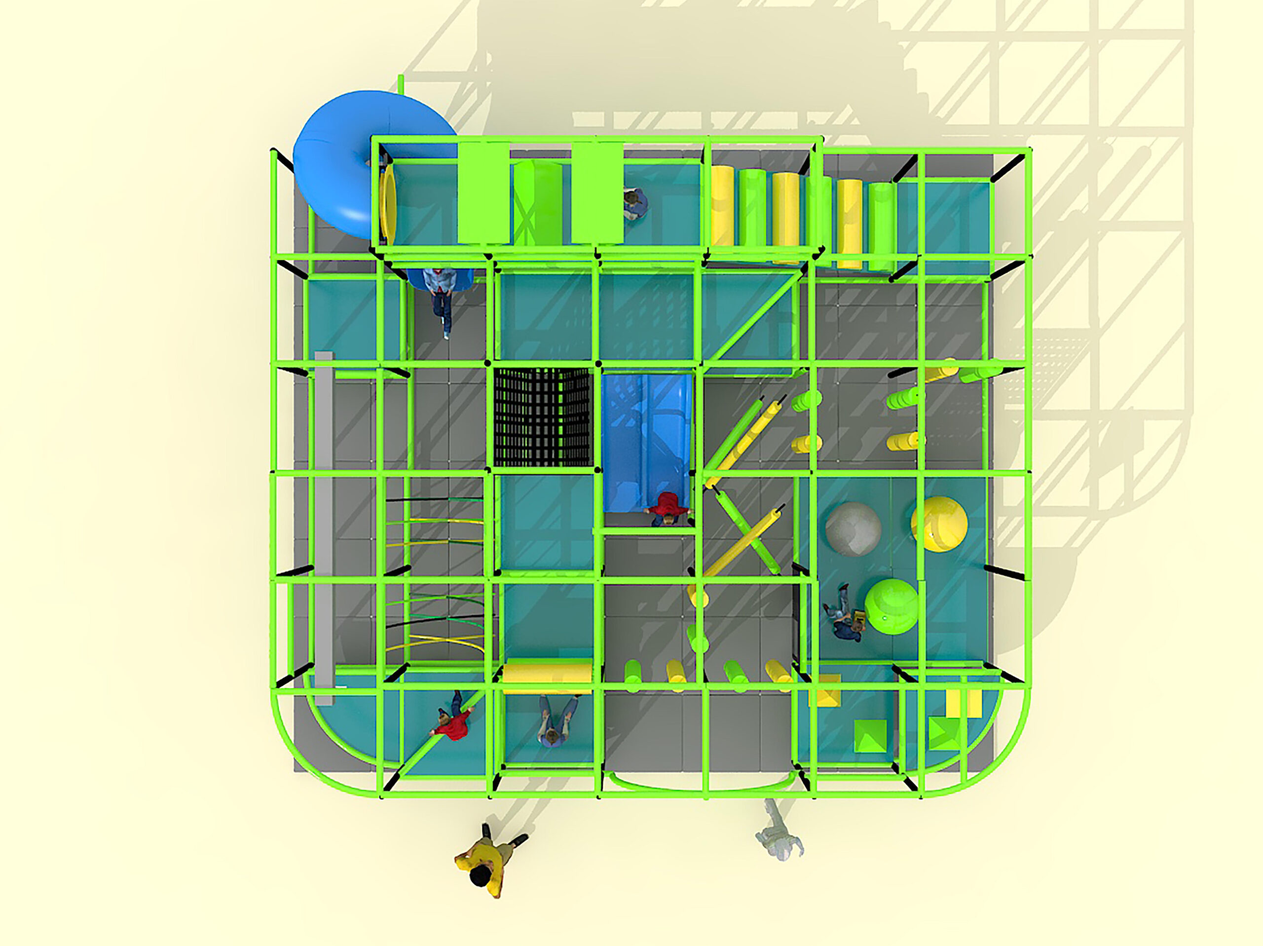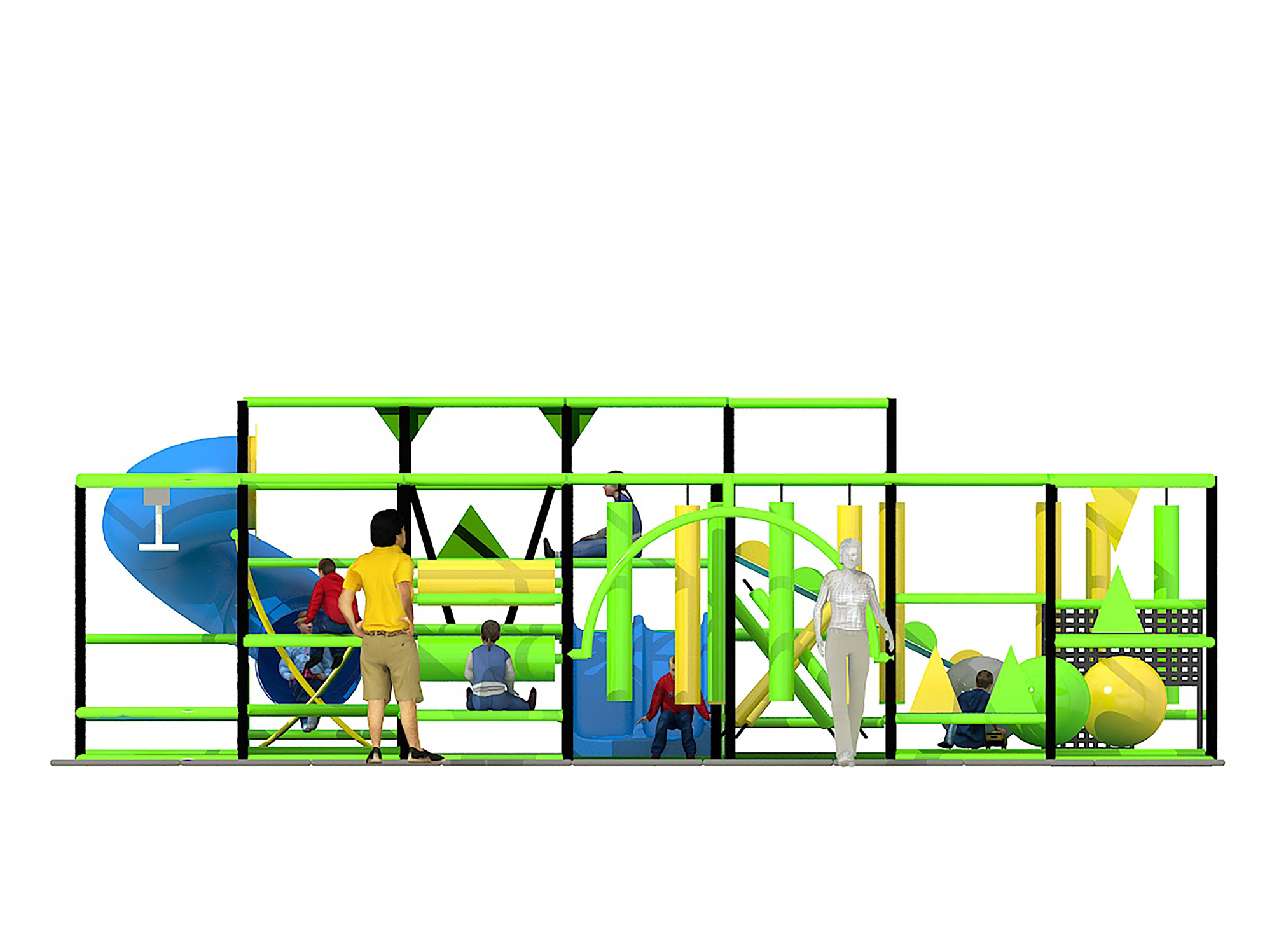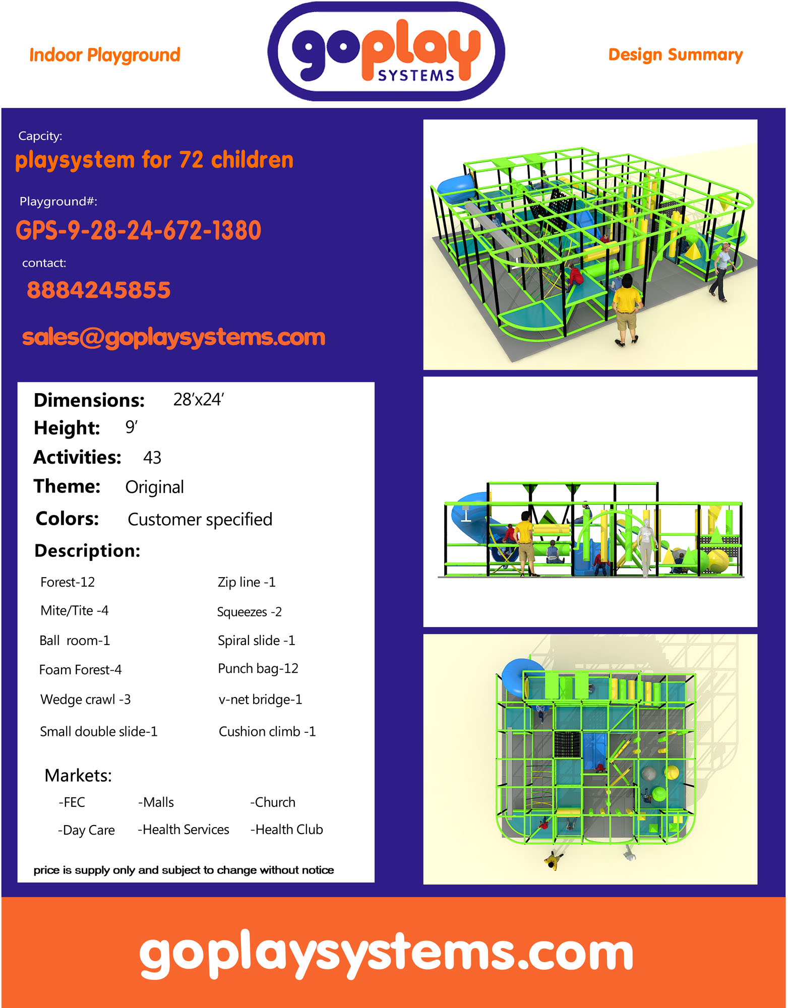 Indoor Playground GPS1380 is a custom indoor playsystem for children three to twelve years of age. The softplay unit measures 28 ft. wide by 9 ft. high and a length of 24 ft. The minimum room space required for this children’s play equipment is approximately 34 ft. room width with a 11 ft. ceiling and 30 ft. room length. Total area: 672 sq ft. Medium Size Indoor Playground.