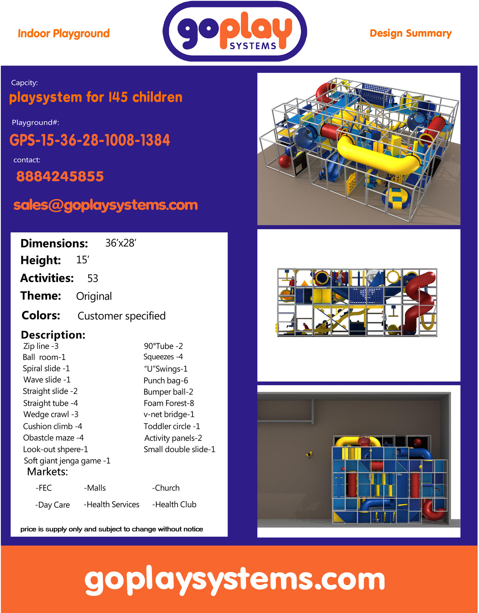 Indoor Playground GPS1384 is a custom indoor playsystem for children three to twelve years of age. The softplay unit measures 36 ft. wide by 15 ft. high and a length of 28 ft. The minimum room space required for this children’s play equipment is approximately 42 ft. room width with a 17 ft. ceiling and 34 ft. room length. Total area: 1008 sq ft. Medium Size Indoor Playground.
