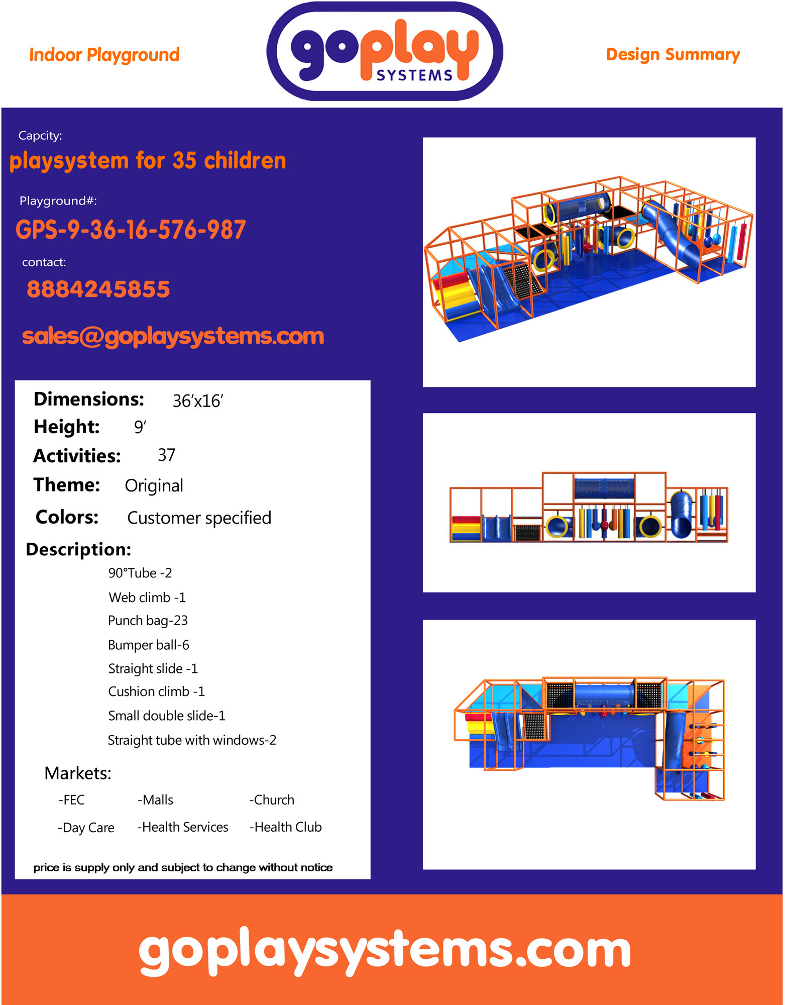 Indoor Playground GPS987 is a custom designed module soft play system. The playground system measures 9 ft. H x 36 ft. W x 16 ft.