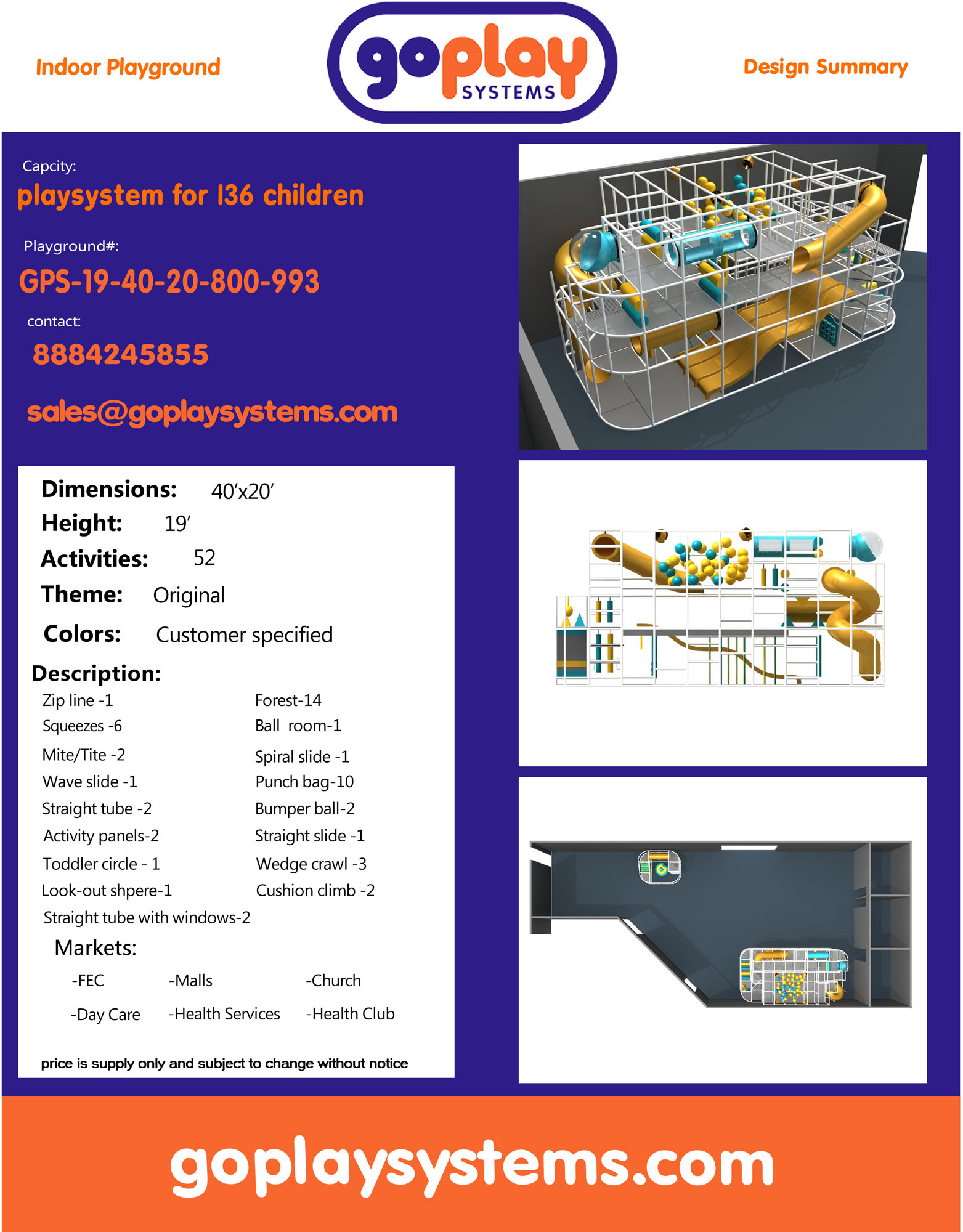 Availability: In-stock Brand: Go Play Systems SKU: gps-19-40-20-800-993 Shipping: Free Shipping US to lower 48 states. Shipping Policy Return and Refund Policy *GoPlay sells worldwide. Prices may not include additional shipping and handling charges to your specific location. Contact us for current international shipping rates.