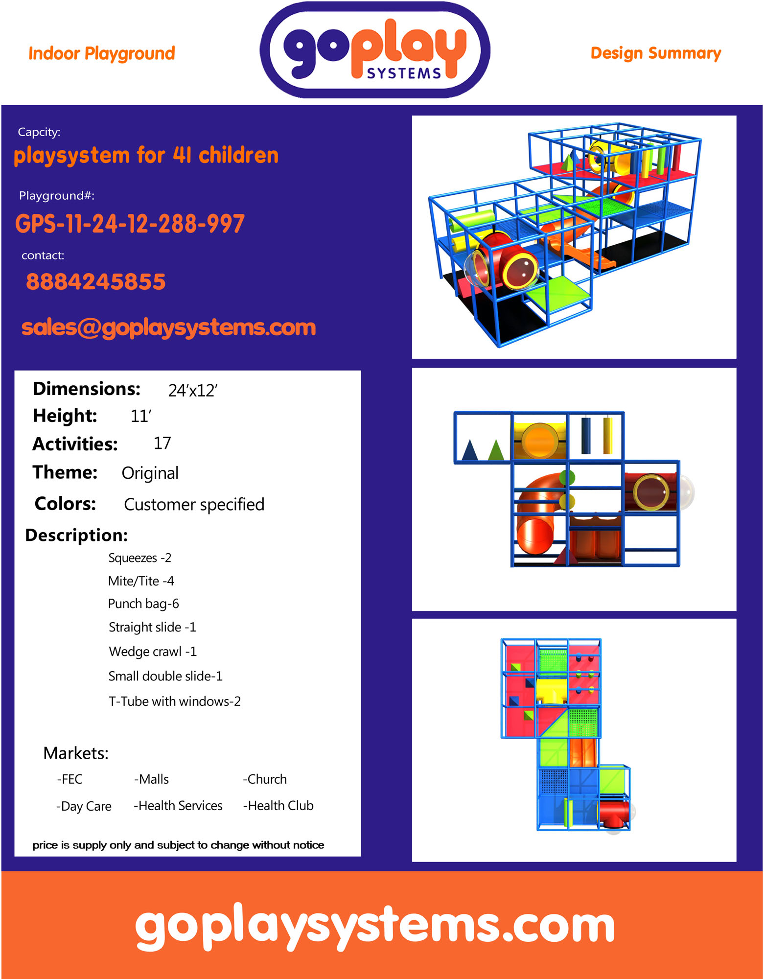 Indoor Playground GPS997 is a custom designed module soft play system. The playground system measures 11 ft. H x 24 ft. W x 12 ft.