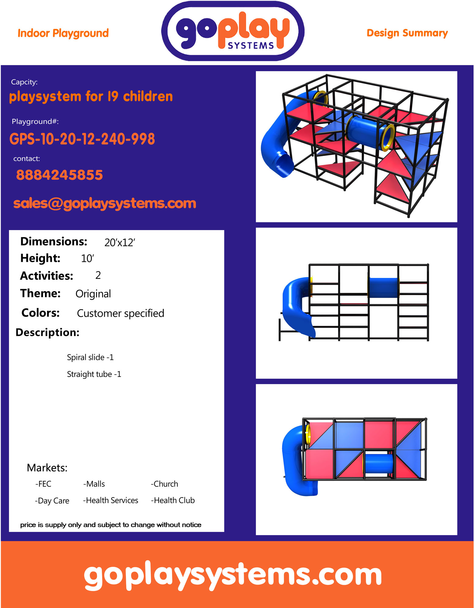 Indoor Playground GPS998 is a custom designed module soft play system. The playground system measures 10 ft. H x 20 ft. W x 12 ft.